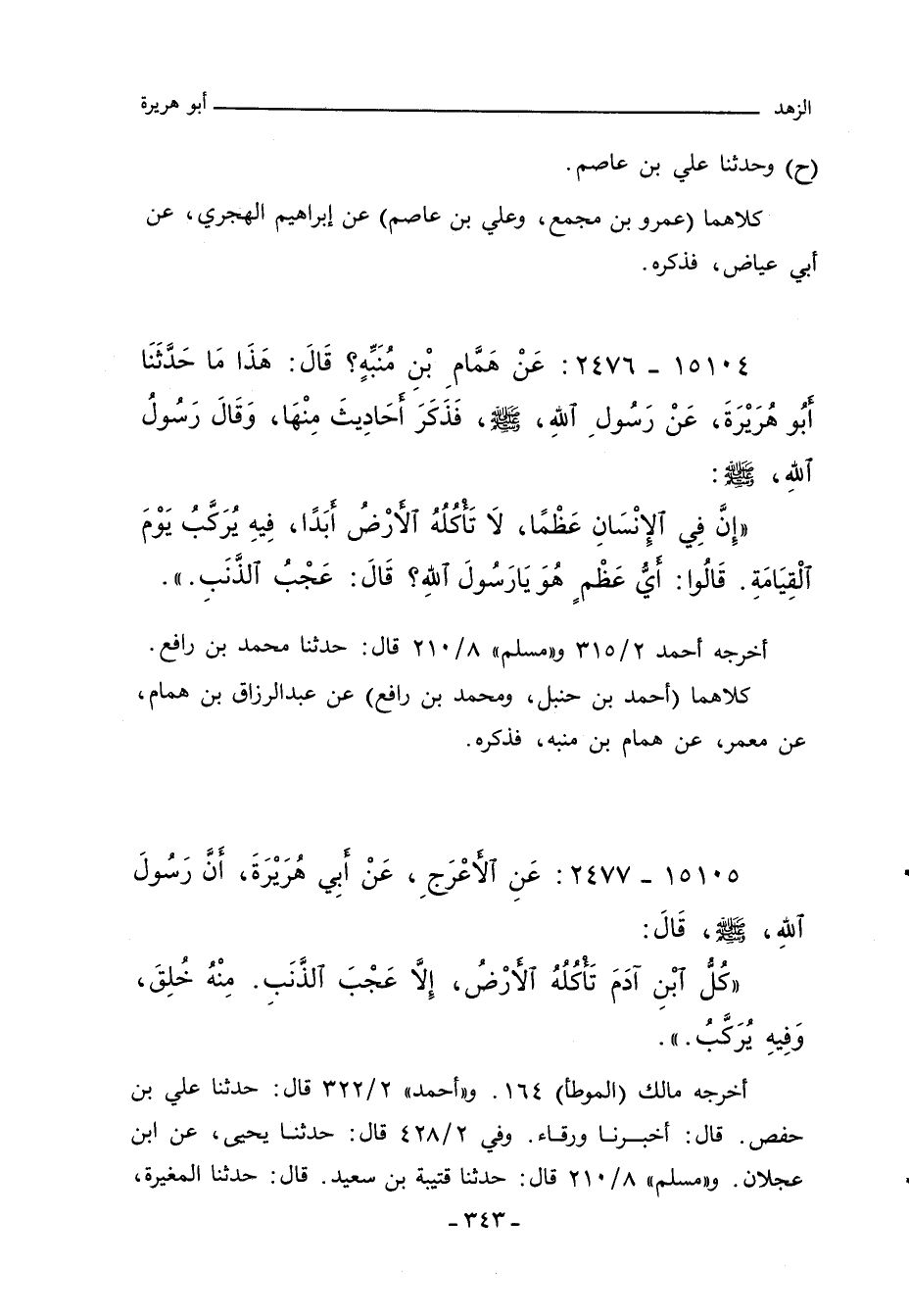 ١٥١٠٤ - عَنْ هَمَّامِ بْنِ مُنَبِّهٍ قَالَ هَذَا مَا حَدَّثَنَا أَبُو هُرَيْرَةَ عَنْ رَسُولِ اللهِ صلى الله عليه وسلم فَذَكَرَ أَحَادِيثَ مِنْهَا وَقَالَ رَسُولُ اللهِ صلى الله عليه وسلم