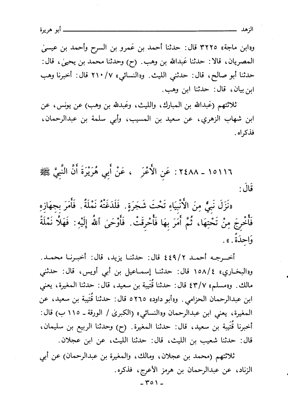 نَزَلَ نَبِىٌّ مِنَ الأَنْبِيَاءِ تَحْتَ شَجَرَةٍ فَلَدَغَتْهُ نَمْلَةٌ فَأَمَرَ بِجِهَازِهِ فَأُخْرِجَ مِنْ تَحْتِهَا ثُمَّ أَمَرَ بِهَا فَأُحْرِقَتْ فَأَوْحَى اللَّهُ إِلَيْهِ فَهَلَاّ نَمْلَةً وَاحِدَة.