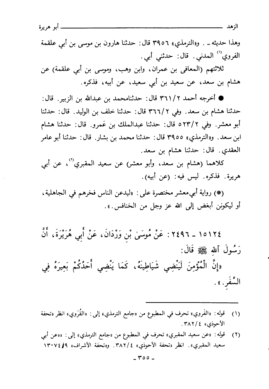 - وهذا حديثه-. و"التِّرمِذي" ٣٩٥٦ قال: حدَّثنا هارون بن موسى بن أبي علقمة الفروي المدني، قال: حدَّثني أبي.