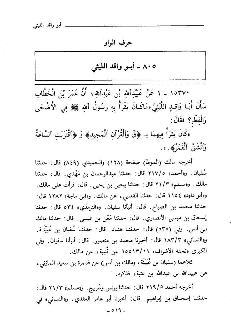 ١٥٣٧٠ - عَنْ عُبَيْدِ الله بْنِ عبد اللهِ؛ أنَّ عُمَرَ بْنَ الْخَطَّابِ سَألَ أبَا وَاقِدٍ اللَّيْثِيِّ؛ مَاكَانَ يَقْرَأ بهِ رَسُولُ اللهِ صلى الله عليه وسلم في الأضْحَى وَالْفِطْرِ؛ فَقَالَ: َ