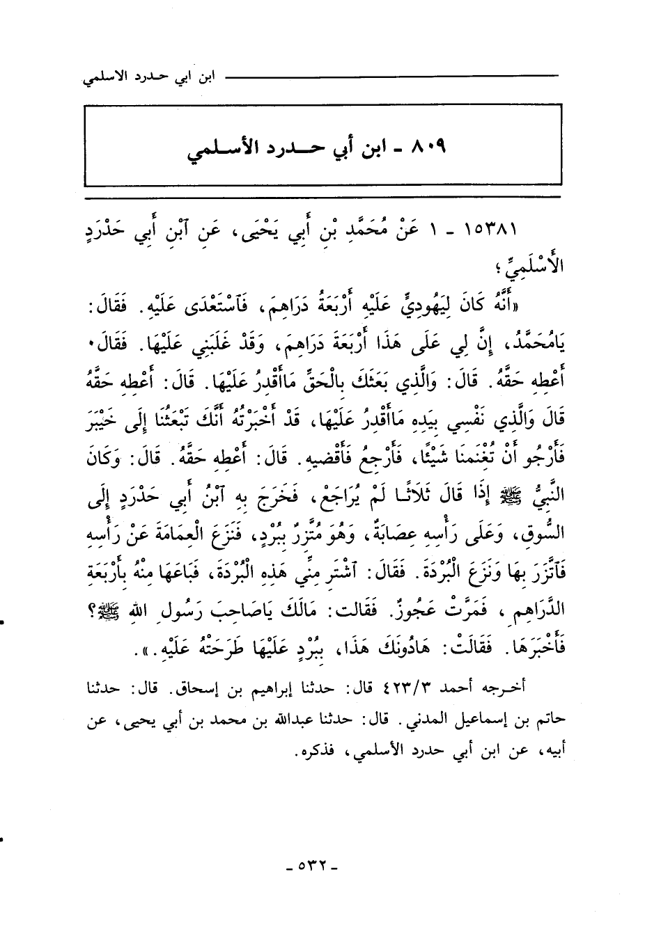 ١٥٣٨١ - عَنْ مُحَمَّدِ بْنِ أَبِى يَحْيَى عَنْ أَبِيهِ عَنِ ابْنِ أَبِى حَدْرَدٍ الأَسْلَمِىِّ