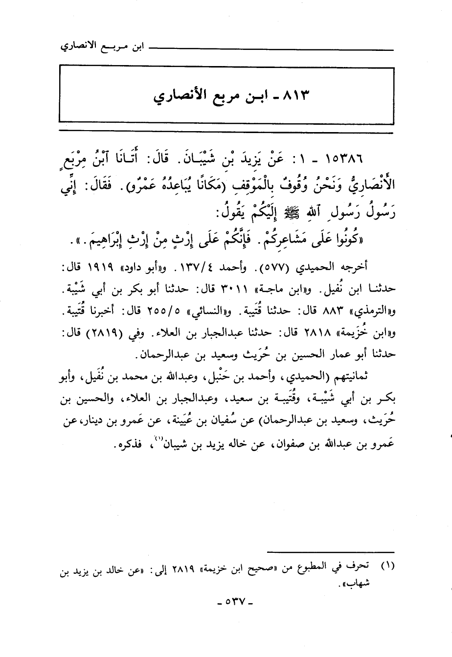 ١٥٣٨٦ - عَنْ يَزِيدَ بْنِ شَيْبَانَ , قال: أتانَا ابْنُ مِرْبَعٍ الأنْصَارِيُّ وَنَحْنُ وُقُوفٌ بِالْمَوْقِفِ (مَكَانًا يُبَاعِدُهُ عَمْرٌو). فَقَالَ: إِنِّي رَسُولُ رَسُولِ اللهِّ صلى الله عليه وسلم إِلَيْكُمْ يَقُولُ: