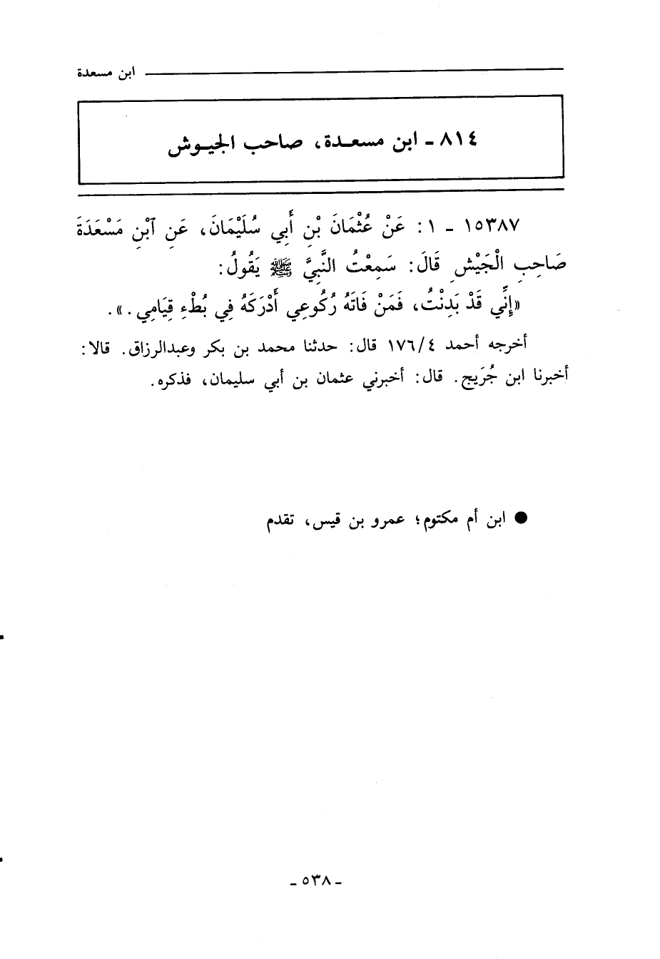١٥٣٨٧ - عَنْ عُثْمَانَ بْنِ أبي سُلَيْمَانَ، عَنِ ابْنِ مَسْعَدَةَ صَاحِبِ الْجَيْشِ قَالَ: سَمِعْتُ النَّبِيَّ صلى الله عليه وسلم يَقُولُ:
