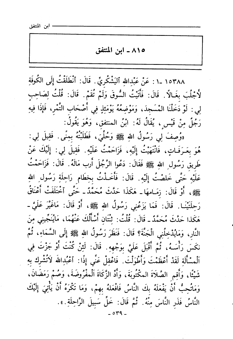 ((وُصِفَ لِى رَسُولُ اللهِ صلى الله عليه وسلم وَحُلِّىَ فَطَلَبْتُهُ بِمَكَّةَ فَقِيلَ لِى هُوَ بِمِنًى فَطَلَبْتُهُ بِمِنًى فَقِيلَ لِى هُوَ بِعَرَفَاتٍ فَانْتَهَيْتُ إِلَيْهِ فَزَاحَمْتُ عَلَيْهِ فَقِيلَ لِى إِلَيْكَ عَنْ طَرِيقِ رَسُولِ اللهِ صلى الله عليه وسلم. فَقَالَ دَعُوا الرَّجُلَ أَرِبَ مَا لَهُ. قَالَ فَزَاحَمْتُ عَلَيْهِ حَتَّى خَلَصْتُ إِلَيْهِ - قَالَ - فَأَخَذْتُ بِخِطَامِ رَاحِلَةِ رَسُولِ اللهِ صلى الله عليه وسلم - أَوْ قَالَ زِمَامِهَا. هَكَذَا حَدَّثَ مُحَمَّدٌ - حَتَّى اخْتَلَفَتْ أعْنَاقُ رَاحِلَتَيْنَا - قَالَ - فَمَا يَزَعُنِى رَسُولُ اللهِ صلى الله عليه وسلم. أَوْ قَالَ مَا غَيَّرَ عَلَىَّ. هَكَذَا حَدَّثَ مُحَمَّدٌ. قَالَ قُلْتُ ثِنْتَانِ أَسْأَلُكَ عَنْهُمَا مَا يُنَجِّينِى مِنَ النَّارِ وَمَا يُدْخِلُنِى الْجَنَّةَ قَالَ فَنَظَرَ رَسُولُ اللهِ صلى الله عليه وسلم إِلَى السَّمَاءِ ثُمَّ نَكَسَ رَأْسَهُ ثُمَّ أَقْبَلَ عَلَىَّ بِوَجْهِهِ قَالَ لَئِنْ كُنْتَ أَوْجَزْتَ فِى الْمَسْأَلَةِ لَقَدْ أَعْظَمْتَ وَأَطْوَلْتَ فَاعْقِلْ عَنِّى إِذًا اعْبُدِ اللَّهَ لَا تُشْرِكْ بِهِ شَيْئًا وَأَقِمِ الصَّلَاةَ الْمَكْتُوبَةَ وَأَدِّ الزَّكَاةَ الْمَفْرُوضَةَ وَصُمْ رَمَضَانَ وَمَا تُحِبُّ أَنْ يَفْعَلَهُ بِكَ النَّاسُ فَافْعَلْهُ بِهِمْ وَمَا تَكْرَهُ أَنْ يَأْتِىَ إِلَيْكَ النَّاسُ فَذَرِ النَّاسَ مِنْهُ.