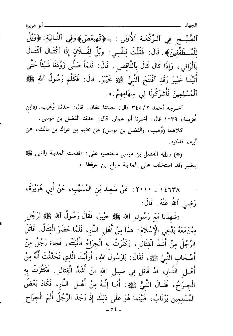 شَهِدْنَا مَعَ رَسُولِ اللهِ صلى الله عليه وسلم خَيْبَرَ فَقَالَ رَسُولُ اللهِ صلى الله عليه وسلم لِرَجُلٍ مِمَّنْ مَعَهُ يَدَّعِى الإِسْلَامَ هَذَا مِنْ أَهْلِ النَّارِ. فَلَمَّا حَضَرَ الْقِتَالُ قَاتَلَ الرَّجُلُ مِنْ أَشَدِّ الْقِتَالِ، وَكَثُرَتْ بِهِ الْجِرَاحُ فَأَثْبَتَتْهُ، فَجَاءَ رَجُلٌ مِنْ أَصْحَابِ النَّبِيِّ صلى الله عليه وسلم فَقَالَ يَا رَسُولَ اللهِ أَرَأَيْتَ الَّذِى تَحَدَّثْتَ أَنَّهُ مِنْ أَهْلِ النَّارِ قَدْ قَاتَلَ فِى سَبِيلِ اللهِ مِنْ أَشَدِّ الْقِتَالِ، فَكَثُرَتْ بِهِ الْجِرَاحُ. فَقَالَ النَّبِيُّ صلى الله عليه وسلم أَمَا إِنَّهُ مِنْ أَهْلِ النَّارِ. فَكَادَ بَعْضُ الْمُسْلِمِينَ يَرْتَابُ فَبَيْنَمَا هُوَ عَلَى ذَلِكَ إِذْ وَجَدَ الرَّجُلُ أَلَمَ الْجِرَاحِ