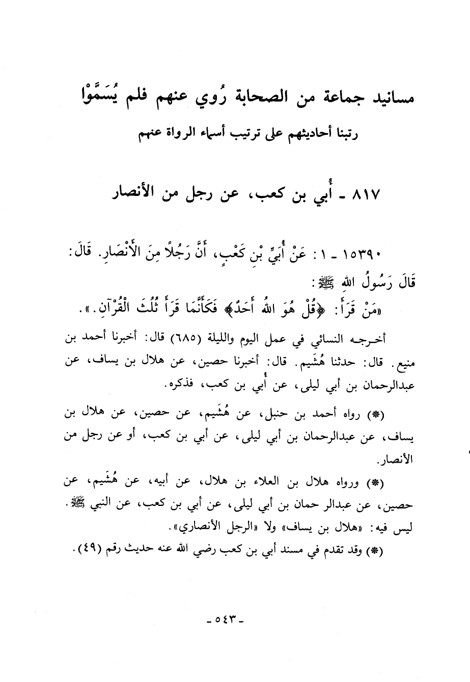 ١٥٣٩٠ - عَنْ أَبِي بْنِ كَعْبٍ، أَنَّ رَجُلاً مِنَ الأَنْصَارِ قَالَ: قَالَ رَسُولُ اللهِ صلى الله عليه وسلم: