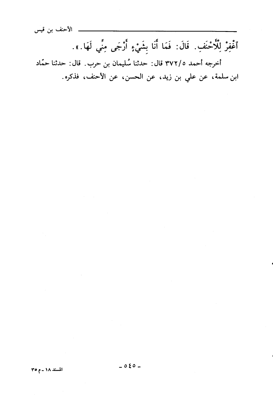 أخرجه أحمد ٥/ ٣٧٢ (٢٣٥٤٨) قال: حدَّثنا سُليمان بن حرب، قال: حدَّثنا حمّاد بن سلمة، عن علي بن زيد، عن الحسن، عن الأحنف، فذكره.