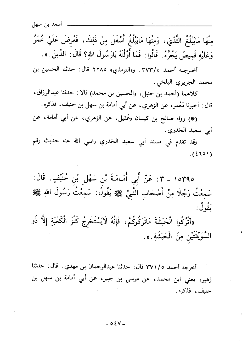 كلاهما (أحمد بن حنبل، والحسين بن محمد) قالا: حدَّثنا عبد الرزاق، قال: أخبرنا مَعْمر، عن الزهري، عَنْ أَبِي أمامة بن سهل بن حنيف، فذكره.