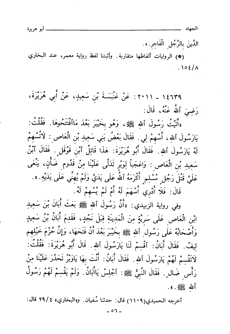 أَتَيْتُ رَسُولَ اللهِ صلى الله عليه وسلم وَهْوَ بِخَيْبَرَ بَعْدَ مَا افْتَتَحُوهَا، فَقُلْتُ يَا رَسُولَ اللهِ أَسْهِمْ لِى. فَقَالَ بَعْضُ بَنِى سَعِيدِ بْنِ الْعَاصِ لَا تُسْهِمْ لَهُ يَا رَسُولَ اللهِ. فَقَالَ أَبُو هُرَيْرَةَ هَذَا قَاتِلُ ابْنِ قَوْقَلٍ. فَقَالَ ابْنُ سَعِيدِ بْنِ الْعَاصِ وَاعَجَبًا لِوَبْرٍ تَدَلَّى عَلَيْنَا مِنْ قَدُومِ ضَأْنٍ، يَنْعَى عَلَىَّ قَتْلَ رَجُلٍ مُسْلِمٍ أَكْرَمَهُ اللَّهُ عَلَى يَدَىَّ وَلَمْ يُهِنِّى عَلَى يَدَيْهِ. قَالَ فَلَا أَدْرِى أَسْهَمَ لَهُ أَمْ لَمْ يُسْهِمْ لَهُ. قَالَ سُفْيَانُ وَحَدَّثَنِيهِ السَّعِيدِىُّ عَنْ جَدِّهِ عَنْ أَبِي هُرَيْرَةَ. قَالَ أَبُو عَبْدِ اللهِ السَّعِيدِىُّ عَمْرُو بْنُ يَحْيَى بْنِ سَعِيدِ بْنِ عَمْرِو بْنِ سَعِيدِ بْنِ الْعَاصِ.
