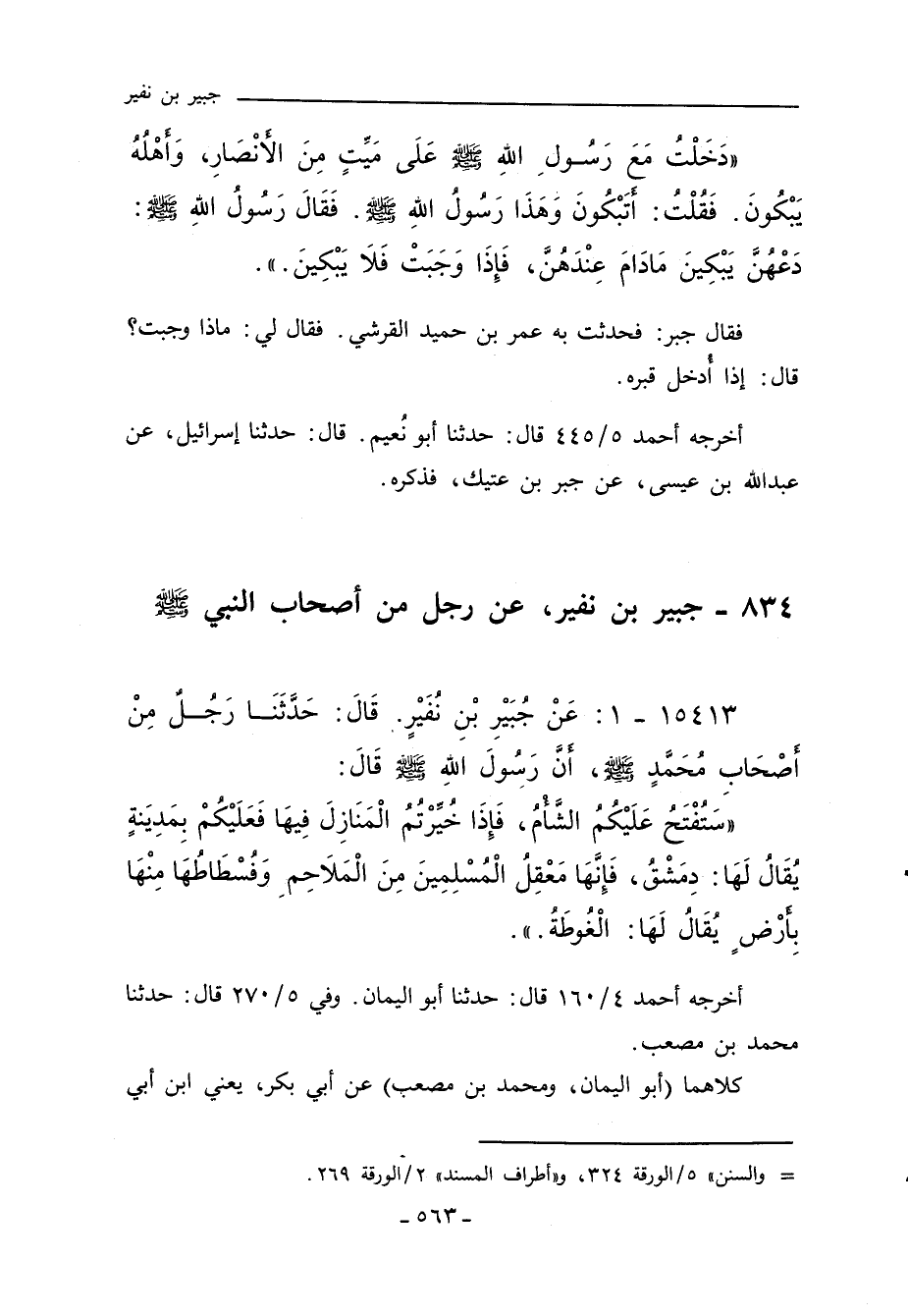 ١٥٤١٣ - عَنْ جُبَيْرِ بْنِ نُفَيْرٍ , قال: حَدَّثَنَا رَجُلٌ مِنْ أصْحَابِ مُحَمَّدٍ صلى الله عليه وسلم؛ أنَّ رَسُولَ اللهِ صلى الله عليه وسلم قَالََ: