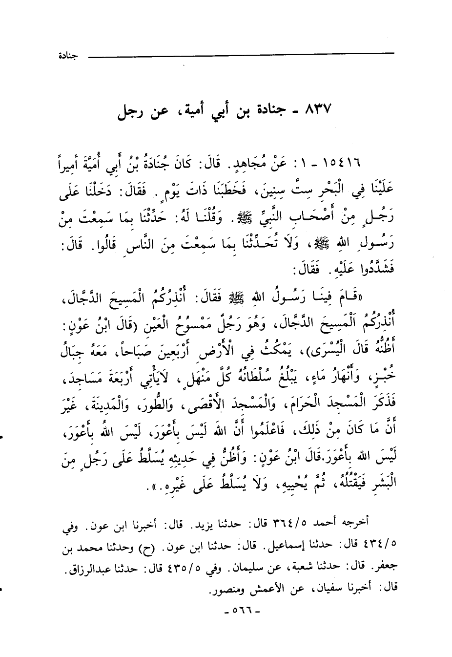١٥٤١٦ - عَنْ مُجَاهِدٍ قَالَ كَانَ جُنَادَةُ بْنُ أَبِى أُمَيَّةَ أَمِيرًا عَلَيْنَا فِى الْبَحْرِ سِتَّ سِنِينَ فَخَطَبَنَا ذَاتَ يَوْمٍ فَقَالَ دَخَلْنَا عَلَى رَجُلٍ مِنْ أَصْحَابِ النَّبِيِّ صلى الله عليه وسلم وَقُلْنَا لَهُ حَدِّثْنَا بِمَا سَمِعْتَ مِنْ رَسُولِ اللهِ صلى الله عليه وسلم وَلَا تُحَدِّثْنَا بِمَا سَمِعْتَ مِنَ النَّاسِ. قَالُوا قَالَ فَشَدَّدُوا عَلَيْهِ فَقَالَ قَامَ فِينَا رَسُولُ اللهِ صلى الله عليه وسلم فَقَالَ: