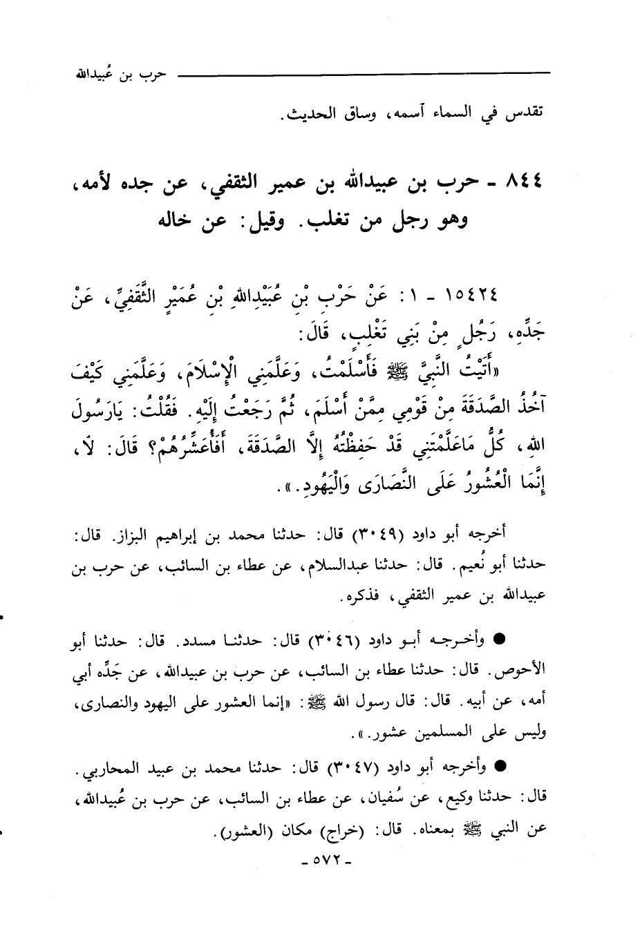 أخرجه أبو داود (٣٠٤٩) قال: حدَّثنا محمد بن إبراهيم البزاز، قال: حدَّثنا أبو نعيم، قال: حدَّثنا عبد السلام، عن عطاء بن السائمب، عن حرب بن عبيد اللهِ بن عمير الثقفي، فذكره.