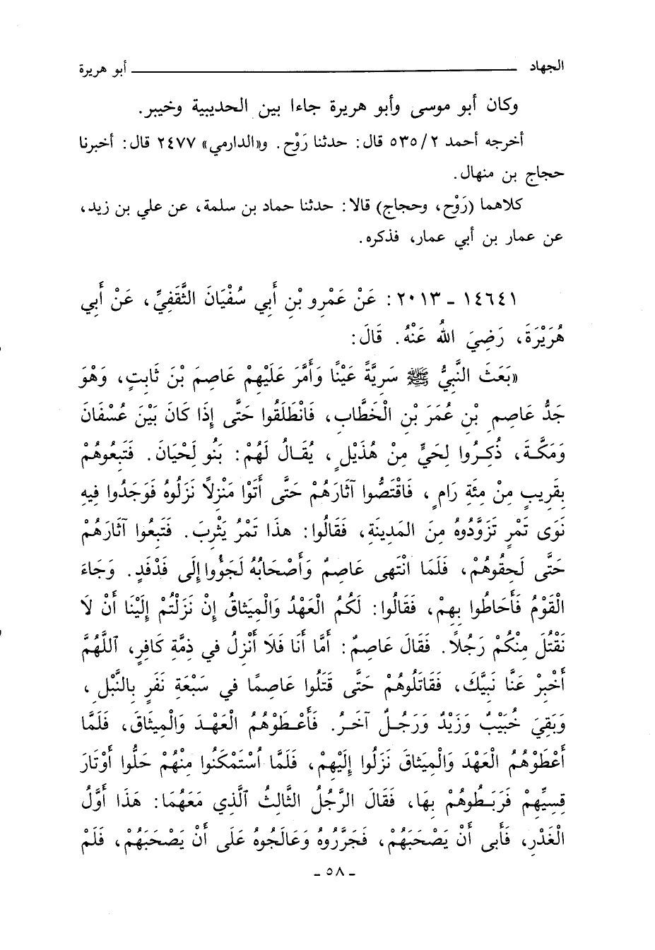 بَعَثَ رَسُولُ اللهِ صلى الله عليه وسلم سَرِيَّةً عَيْنًا وَأَمَّرَ عَلَيْهِمْ عَاصِمَ بْنَ ثَابِتٍ - وَهُوَ جَدُّ عَاصِمِ بْنِ عُمَرَ - فَانْطَلَقُوا حَتَّى إِذَا كَانُوا بِبَعْضِ الطَّرِيقِ بَيْنَ عُسْفَانَ وَمَكَّةَ نُزُولاً ذُكِرُوا لِحَىٍّ مِنْ هُذَيْلٍ يُقَالُ لَهُمْ بَنُو لِحْيَانَ فَتَبِعُوهُمْ بِقَرِيبٍ مِنْ مِائَةِ رَجُلٍ رَامٍ فَاقْتَصُّوا آثَارَهُمْ حَتَّى نَزَلُوا مَنْزِلاً نَزَلُوهُ فَوَجَدُوا فِيهِ نَوَى تَمْرٍ تَزَوَّدُوهُ مِنْ تَمْرِ الْمَدِينَةِ فَقَالُوا هَذَا مِنْ تَمْرِ يَثْرِبَ فَاتَّبَعُوا آثَارَهُمْ حَتَّى لَحِقُوهُمْ فَلَمَّا آنَسَهُمْ عَاصِمُ بْنُ ثَابِتٍ وَأَصْحَابُهُ لَجَئُوا إِلَى فَدْفَدٍ وَجَاءَ الْقَوْمُ فَأَحَاطُوا بِهِمْ وَقَالُوا لَكُمُ الْعَهْدُ وَالْمِيثَاقُ إِنْ نَزَلْتُمْ إِلَيْنَا أَنْ لَا نَقْتُلَ مِنْكُمْ رَجُلاً فَقَالَ عَاصِمُ بْنُ ثَابِتٍ أَمَّا أَنَا فَلَا أَنْزِلُ فِى ذِمَّةِ كَافِرٍ اللَّهُمَّ أَخْبِرْ عَنَّا رَسُولَكَ. قَالَ فَقَاتَلُوهُمْ فَرَمَوْهُمْ فَقَتَلُوا عَاصِمًا فِى سَبْعَةِ نَفَرٍ وَبَقِىَ خُبَيْبُ بْنُ عَدِىٍّ وَزَيْدُ بْنُ الدَّثِنَةِ وَرَجُلٌ آخَرُ فَأَعْطَوْهُمُ الْعَهْدَ وَالْمِيثَاقَ إِنْ نَزَلُوا إِلَيْهِمْ فَلَمَّا اسْتَمْكَنُوا مِنْهُمْ حَلُّوا أَوْتَارَ قِسِيِّهِمْ فَرَبَطُوهُمْ بِهَا فَقَالَ الرَّجُلُ الثَّالِثُ الَّذِى مَعَهُمَا هَذَا أَوَّلُ الْغَدْرِ. فَأَبَى أَنْ يَصْحَبَهُمْ