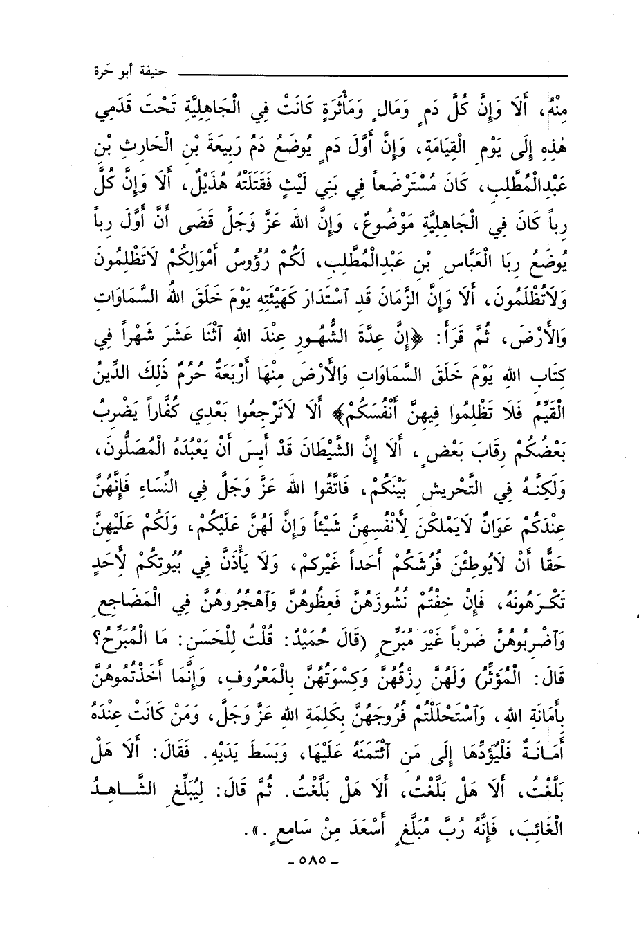 مِنْهُ أَلَا وَإِنَّ كُلَّ دَمٍ وَمَالٍ وَمَأْثَرَةٍ كَانَتْ فِى الْجَاهِلِيَّةِ تَحْتَ قَدَمِى هَذِهِ إِلَى يَوْمِ الْقِيَامَةِ وَإِنَّ أَوَّلَ دَمٍ يُوضَعُ دَمُ رَبِيعَةَ بْنِ الْحَارِثِ بْنِ عَبْدِ الْمُطَّلِبِ كَانَ مُسْتَرْضِعًا فِى بَنِى لَيْثٍ فَقَتَلَتْهُ هُذَيْلٌ أَلَا وَإِنَّ كُلَّ رِبًا كَانَ فِى الْجَاهِلِيَّةِ مَوْضُوعٌ وَإِنَّ اللَّهَ عَزَّ وَجَلَّ قَضَى أَنَّ أَوَّلَ رِبًا يُوضَعُ رِبَا الْعَبَّاسِ بْنِ عَبْدِ الْمُطَّلِبِ لَكُمْ رُءُوسُ أَمْوَالِكُمْ لَا تَظْلِمُونَ وَلَا تُظْلَمُونَ أَلَا وَإِنَّ الزَّمَانَ قَدِ اسْتَدَارَ كَهَيْئَتِهِ يَوْمَ خَلَقَ اللَّهُ السَّمَوَاتِ وَالأَرْضَ. ثُمَّ قَرَأَ ?إِنَّ عِدَّةَ الشُّهُورِ عِنْدَ اللهِ اثْنَا عَشَرَ شَهْرًا فِى كِتَابِ اللهِ يَوْمَ خَلَقَ السَّمَوَاتِ وَالأَرْضَ مِنْهَا أَرْبَعَةٌ حُرُمٌ ذَلِكَ الدِّينُ الْقَيِّمُ فَلَا تَظْلِمُوا فِيهِنَّ أَنْفُسَكُمْ ? أَلَا لَا تَرْجِعُوا