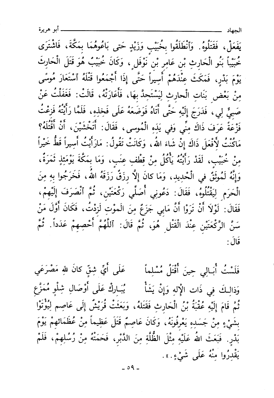 الْحَارِثَ يَوْمَ بَدْرٍ فَمَكَثَ عِنْدَهُمْ أَسِيرًا حَتَّى إِذَا أَجْمَعُوا قَتْلَهُ اسْتَعَارَ مُوسَى مِنْ إِحْدَى بَنَاتِ الْحَارِثِ لِيَسْتَحِدَّ بِهَا فَأَعَارَتْهُ قَالَتْ فَغَفَلْتُ عَنْ صَبِىٍّ لِى فَدَرَجَ إِلَيْهِ حَتَّى أَتَاهُ - قَالَتْ - فَأَخَذَهُ فَوَضَعَهُ عَلَى فَخِذِهِ فَلَمَّا رَأَيْتُهُ فَزِعْتُ فَزَعًا عَرَفَهُ وَالْمُوسَى فِى يَدِهِ فَقَالَ أَتَخْشَيْنَ أَنْ أَقْتُلَهُ مَا كُنْتُ لأَفْعَلَ إِنْ شَاءَ اللَّهُ. قَالَ وَكَانَتْ تَقُولُ مَا رَأَيْتُ أَسِيرًا خَيْرًا مِنْ خُبَيْبٍ قَدْ رَأَيْتُهُ يَأْكُلُ مِنْ قِطْفِ عِنَبٍ وَمَا بِمَكَّةَ يَوْمَئِذٍ ثَمَرَةٌ وَإِنَّهُ لَمُوثَقٌ فِى الْحَدِيدِ وَمَا كَانَ إِلَاّ رِزْقًا رَزَقَهُ اللَّهُ إِيَّاهُ. قَالَ ثُمَّ خَرَجُوا بِهِ مِنَ الْحَرَمِ لِيَقْتُلُوهُ فَقَالَ دَعُونِى أُصَلِّى رَكْعَتَيْنِ. فَصَلَّى رَكْعَتَيْنِ فَقَالَ لَوْلَا أَنْ تَرَوْا مَا بِى جَزَعًا مِنَ الْمَوْتِ لَزِدْتُ. قَالَ وَكَانَ أَوَّلُ مَنْ سَنَّ الرَّكْعَتَيْنِ عِنْدَ الْقَتْلِ هُوَ ثُمَّ قَالَ اللَّهُمَّ أَحْصِهِمْ عَدَدًا مَا أُبَالِى حِينَ أُقْتَلُ مُسْلِمًا عَلَى أَىِّ شِقٍّ كَانَ لِلَّهِ مَصْرَعِى وَذَلِكَ فِى ذَاتِ الإِلَهِ وَإِنْ يَشَأْ يُبَارِكْ عَلَى أَوْصَالِ شِلْوٍ مُمَزَّعِ ثُمَّ قَامَ إِلَيْهِ عُقْبَةُ بْنُ الْحَارِثِ فَقَتَلَهُ وَبَعَثَتْ قُرَيْشٌ إِلَى عَاصِمٍ لِيُؤْتَوْا بِشَىْءٍ مِنْ جَسَدِهِ يَعْرِفُونَهُ وَكَانَ قَتَلَ عَظِيمًا مِنْ عُظَمَائِهِمْ يَوْمَ بَدْرٍ فَبَعَثَ اللَّهُ عَلَيْهِ مِثْلَ الظُّلَّةِ مِنَ الدَّبْرِ فَحَمَتْهُ مِنْ رُسُلِهِمْ فَلَمْ يَقْدِرُوُا عَلَى شَىْءٍ مِنْهُ.