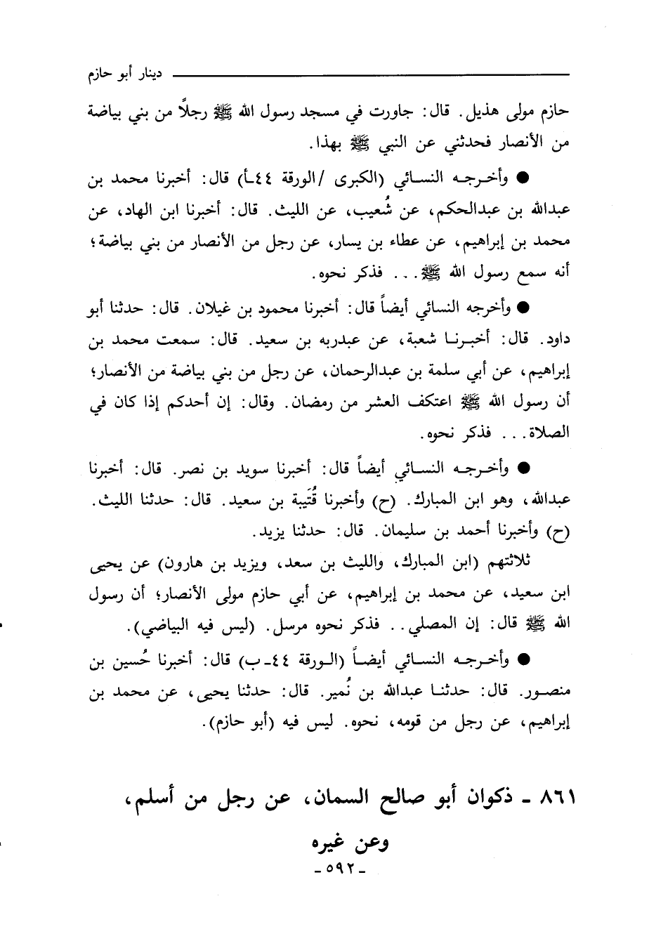 . وأخرجه النسائي ((الكبرى" أيضآَ ٣٣٥٤ قال: أخبرنا حُسين بن منصور، قال: حدَّثنا عبد اللهِ بن نُمير، قال: حدَّثنا يَحيى، عن محمد بن إبراهيم، عن رجل من قومه، نحوه. ليس فيه (أبو حازم).