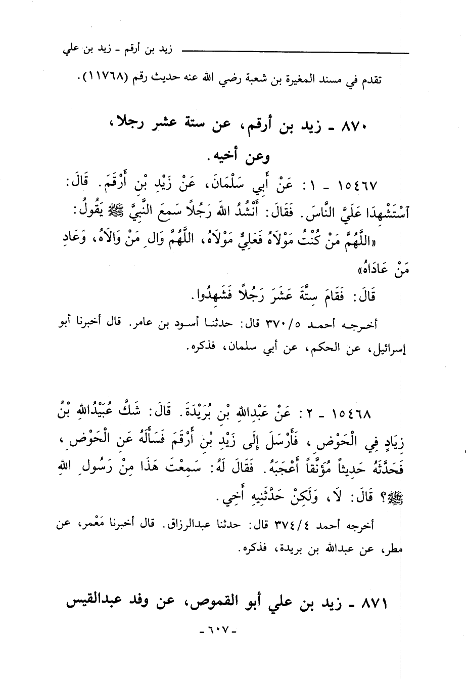١٥٤٦٧ - عَنْ أَبِي سَلْمَانَ، عَنْ زَيْدِ بْنِ أرْقَمَ , قال: اسْتَشْهِدَا عَلَيَّ النَّاسَ. فَقَالَ: أَنْشُدُ اللهَ رَجُلاً سَمعَ النَّبِيَّ صلى الله عليه وسلم يَقُولُ: