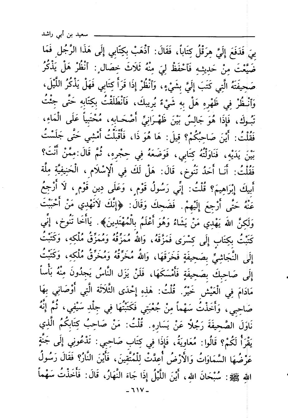 بِى فَدَفَعَ إِلَىَّ هِرَقْلُ كِتَابًا فَقَالَ اذْهَبْ بِكِتَابِى إِلَى هَذَا الرَّجُلِ فَمَا ضَيَّعْتُ مِنْ حَدِيثِهِ فَاحْفَظْ لِى مِنْهُ ثَلَاثَ خِصَالٍ انْظُرْ هَلْ يَذْكُرُ صَحِيفَتَهُ الَّتِى كَتَبَ إِلَىَّ بِشَىْءٍ وَانْظُرْ إِذَا قَرَأَ كِتَابِى فَهَلْ يَذْكُرُ اللَّيْلَ وَانْظُرْ فِى ظَهْرِهِ هَلْ بِهِ شَىْءٌ يَرِيبُكَ. فَانْطَلَقْتُ بِكِتَابِهِ حَتَّى جِئْتُ تَبُوكَ فَإِذَا هُوَ جَالِسٌ بَيْنَ ظَهْرَانَىْ أَصْحَابِهِ مُحْتَبِيًا عَلَى الْمَاءِ فَقُلْتُ أَيْنَ صَاحِبُكُمْ قِيلَ هَا هُوَ ذَا. فَأَقْبَلْتُ أَمْشِى حَتَّى جَلَسْتُ بَيْنَ يَدَيْهِ فَنَاوَلْتُهُ كِتَابِى فَوَضَعَهُ فِى حَجْرِهِ ثُمَّ قَالَ مِمَّنْ أَنْتَ. فَقُلْتُ أَنَا أَحَدُ تَنُوخَ. قَالَ هَلْ لَكَ فِى الإِسْلَامِ الْحَنِيفِيَّةِ مِلَّةِ أَبِيكَ إِبْرَاهِيمَ. قُلْتُ إِنِّى رَسُولُ قَوْمٍ وَعَلَى دِينِ قَوْمٍ لَا أَرْجِعُ عَنْهُ حَتَّى أَرْجِعَ إِلَيْهِمْ فَضَحِكَ وَقَالَ ? إِنَّكَ لَا تَهْدِى مَنْ أَحْبَبْتَ وَلَكِنَّ اللَّهَ يَهْدِى مَنْ يَشَاءُ وَهُوَ أَعْلَمُ بِالْمُهْتَدِينَ? يَا أَخَا تَنُوخَ إِنِّى كَتَبْتُ بِكِتَابٍ إِلَى كِسْرَى فَمَزَّقَهُ وَاللَّهُ مُمَزِّقُهُ وَمُمَزِّقٌ مُلْكَهُ وَكَتَبْتُ إِلَى النَّجَاشِىِّ بِصَحِيفَةٍ فَخَرَقَهَا وَاللَّهُ مُخْرِقُهُ وَمُخْرِقٌ مُلْكَهُ وَكَتَبْتُ إِلَى صَاحِبِكَ بِصَحِيفَةٍ فَأَمْسَكَهَا فَلَنْ يَزَالَ النَّاسُ يَجِدُونَ مِنْهُ بَأْسًا مَا دَامَ فِى الْعَيْشِ خَيْرٌ. قُلْتُ هَذِهِ إِحْدَى الثَّلَاثَةِ الَّتِى أَوْصَانِى بِهَا صَاحِبِى وَأَخَذْتُ سَهْمًا