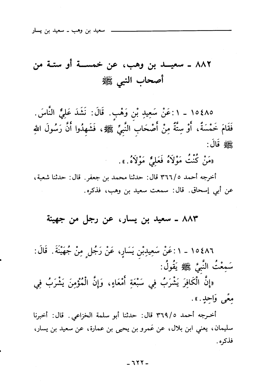 ١٥٤٨٥ - عَنْ سَعِيدِ بْنِ وَهْبٍ , قال: نَشَدَ عَلِيٌّ النَّاسَ. فَقَامَ خَمْسَةٌ، أوْ سِتَّة مِنْ أصْحَابِ النَّبِيِّ صلى الله عليه وسلم، فَشَهِدُوا أنَّ رَسُولَ اللهِ صلى الله عليه وسلم قَالََ: