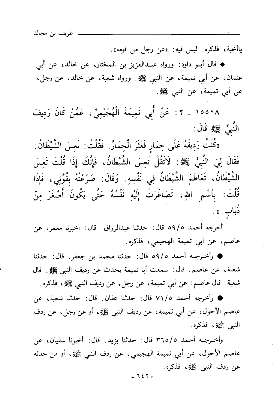 . وأخرجه أحمد ٥/ ٣٦٥ (٢٣٤٨٠) قال: حدَّثنا يزيد، قال: أخبرنا سفيان، عن عاصم الأحول، عَنْ أَبِي تميمة الهجيمي، عن ردف النبي صلى الله عليه وسلم، أو من حدثه عن ردف النبي صلى الله عليه وسلم، فذكره.