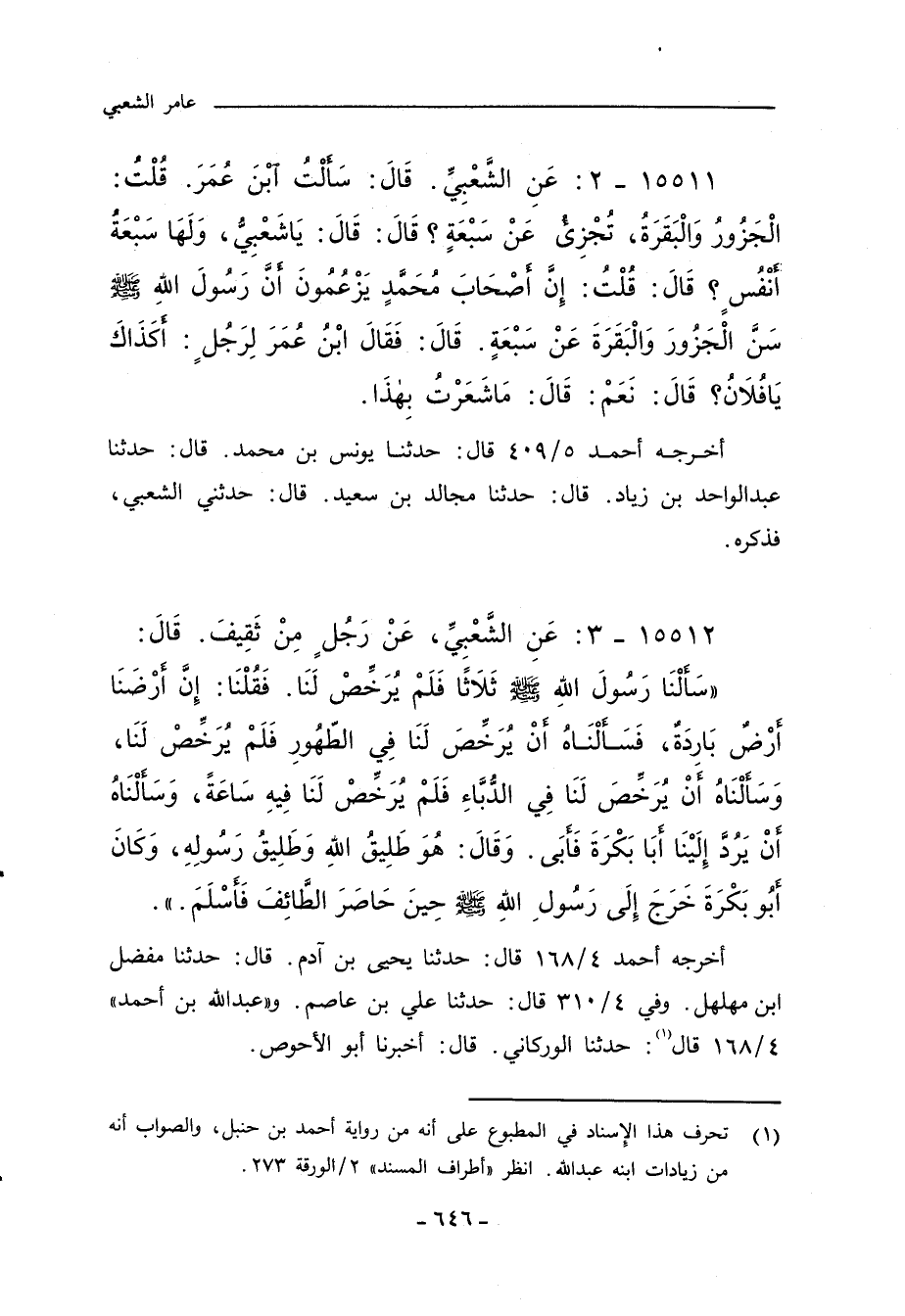 أخرجه أحمد ٥/ ٤٠٩ (٢٣٨٧٤) قال: حدَّثنا يونس بن محمد، قال: حدَّثنا عبد الواحد بن زياد، قال: حدَّثنا مجالد بن سعيد، قال: حدَّثني الشعبي، فذكره.