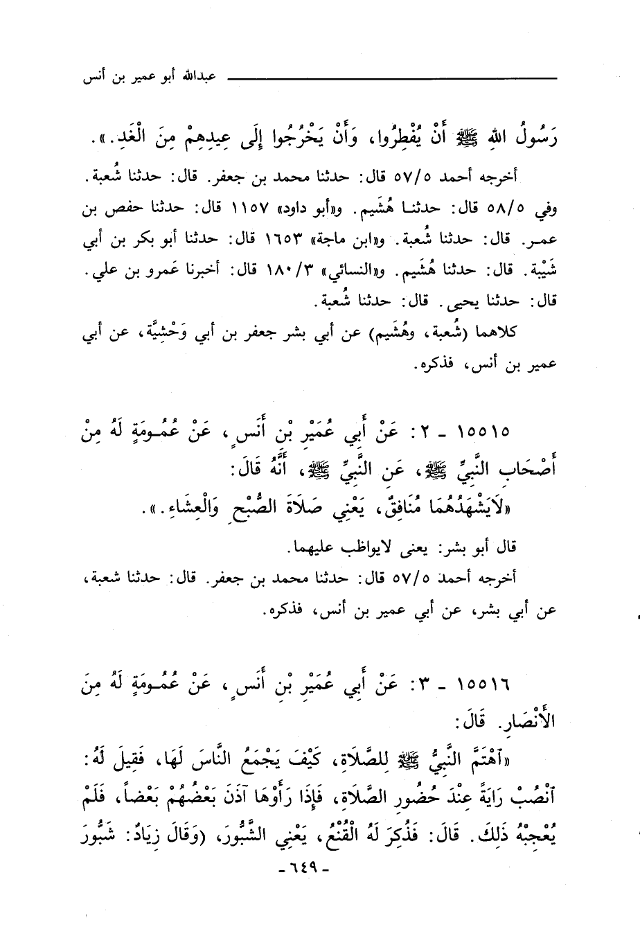 أخرجه أحمد ٥/ ٥٧ (٢٠٨٥٦) قال: حدَّثنا محمد بن جعفر، قال: حدَّثنا شعبة، عَنْ أَبِي بشر، عَنْ أَبِي عمير بن أنس، فذكره.