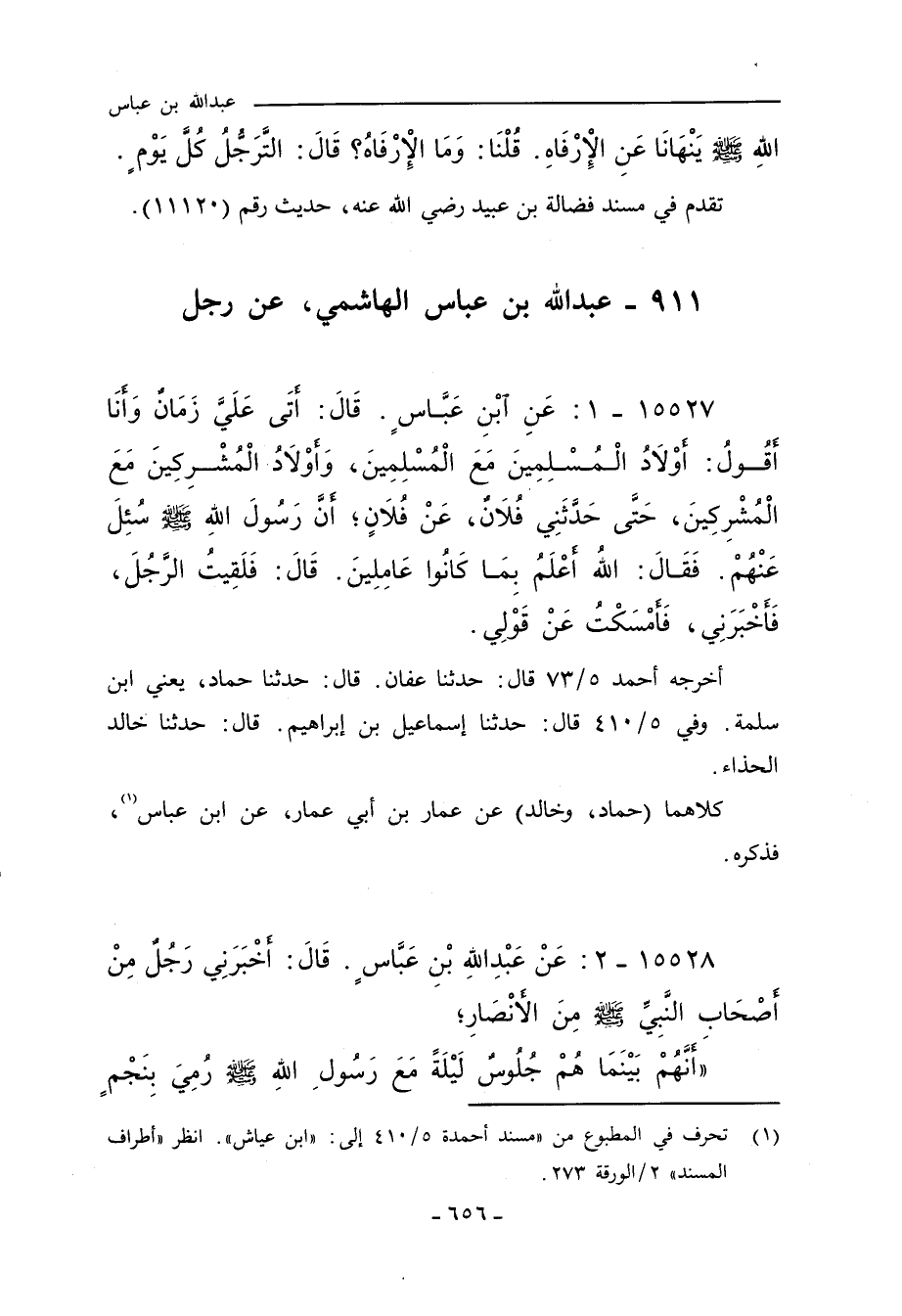 ١٥٥٢٧ - عَنِ ابْنِ عَبَّاسٍ , قال: أَتَى عَلَيَّ زَمَانٌ وَأنَا أقُولُ: أوْلَادُ الْمُسْلِمِينَ مَعَ الْمُسْلِمِينَ، وَأَوْلَادُ الْمُشْرِكِينَ مَعَ الْمُشْرِكِينَ، حَتَّى حَدَّثَنِي فُلَانٌ، عَنْ فُلَانٍ؛ أَنَّ رَسُولَ اللهِ صلى الله عليه وسلم سُئِلَ عَنْهُمْ. فَقَالَ: اللهُ أَعْلَمُ بِمَا كَانُوا عَامِلِينَ, قال: فَلَقِيتُ الرَّجُلَ، فَأخْبَرَنِي، فَأَمْسَكْتُ عَنْ قَوْلِي.