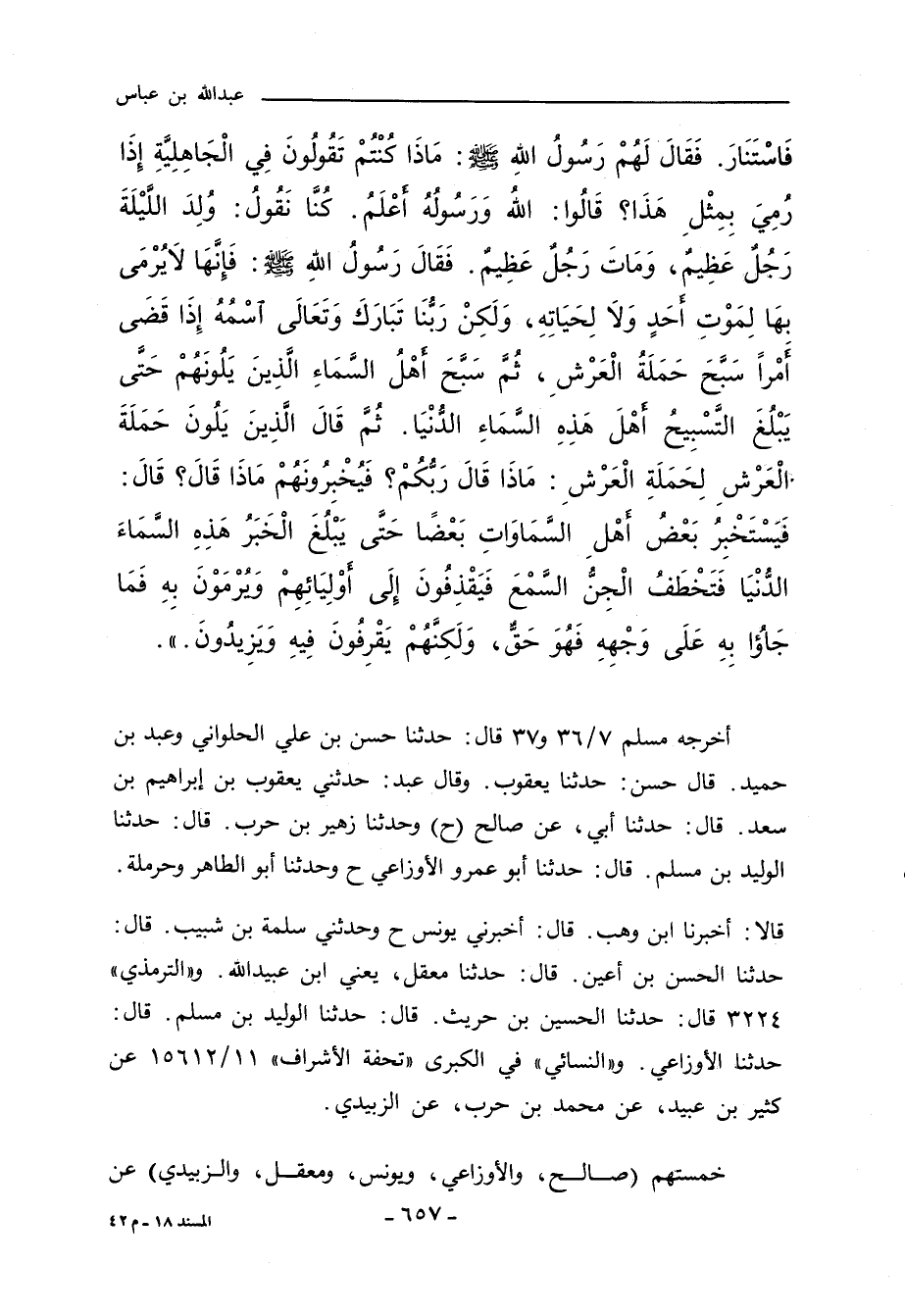 فَاسْتَنَارَ فَقَالَ لَهُمْ رَسُولُ اللهِ صلى الله عليه وسلم مَاذَا كُنْتُمْ تَقُولُونَ فِى الْجَاهِلِيَّةِ إِذَا رُمِىَ بِمِثْلِ هَذَا. قَالُوا اللَّهُ وَرَسُولُهُ أَعْلَمُ كُنَّا نَقُولُ وُلِدَ اللَّيْلَةَ رَجُلٌ عَظِيمٌ وَمَاتَ رَجُلٌ عَظِيمٌ فَقَالَ رَسُولُ اللهِ صلى الله عليه وسلم فَإِنَّهَا لَا يُرْمَى بِهَا لِمَوْتِ أَحَدٍ وَلَا لِحَيَاتِهِ وَلَكِنْ رَبُّنَا تَبَارَكَ وَتَعَالَى اسْمُهُ إِذَا قَضَى أَمْرًا سَبَّحَ حَمَلَةُ الْعَرْشِ ثُمَّ سَبَّحَ أَهْلُ السَّمَاءِ الَّذِينَ يَلُونَهُمْ حَتَّى يَبْلُغَ التَّسْبِيحُ أَهْلَ هَذِهِ السَّمَاءِ الدُّنْيَا ثُمَّ قَالَ الَّذِينَ يَلُونَ حَمَلَةَ الْعَرْشِ لِحَمَلَةِ الْعَرْشِ مَاذَا قَالَ رَبُّكُمْ فَيُخْبِرُونَهُمْ مَاذَا قَالَ - قَالَ - فَيَسْتَخْبِرُ بَعْضُ أَهْلِ السَّمَوَاتِ بَعْضًا حَتَّى يَبْلُغَ الْخَبَرُ هَذِهِ السَّمَاءَ الدُّنْيَا فَتَخْطَفُ الْجِنُّ السَّمْعَ فَيَقْذِفُونَ إِلَى أَوْلِيَائِهِمْ وَيُرْمَوْنَ بِهِ فَمَا جَاءُوا بِهِ عَلَى وَجْهِهِ فَهُوَ حَقٌّ وَلَكِنَّهُمْ يَقْرِفُونَ فِيهِ وَيَزِيدُونَ.