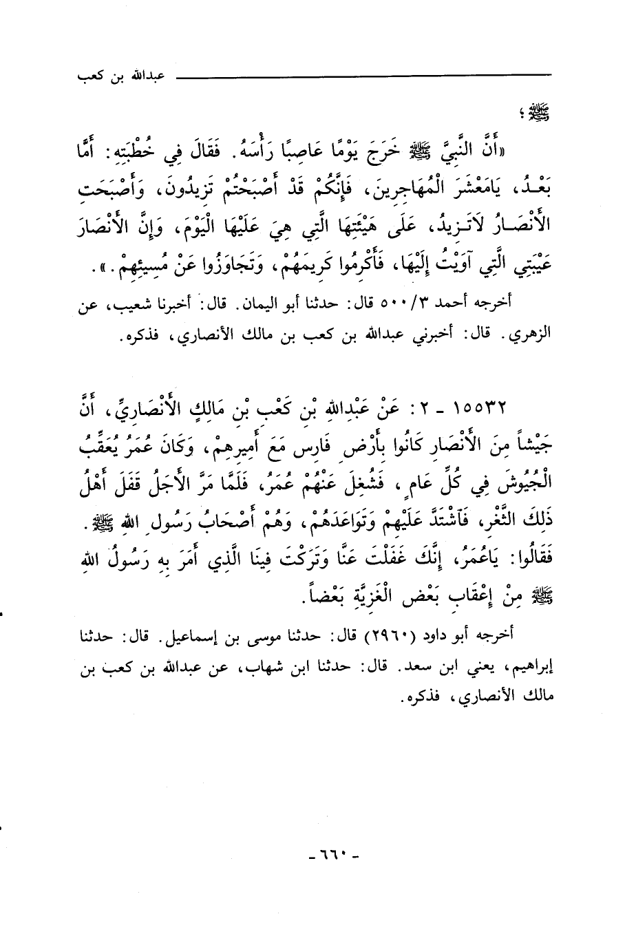 أخرجه أحمد ٣/ ٥٠٠ (١٦١٧٢) قال: حدَّثنا أبو اليمان، قال: أخبرنا شعيب، عن الزهري , قال: أخبرني عبد اللهِ بن كعب بن مالك الأنصاري، فذكره.