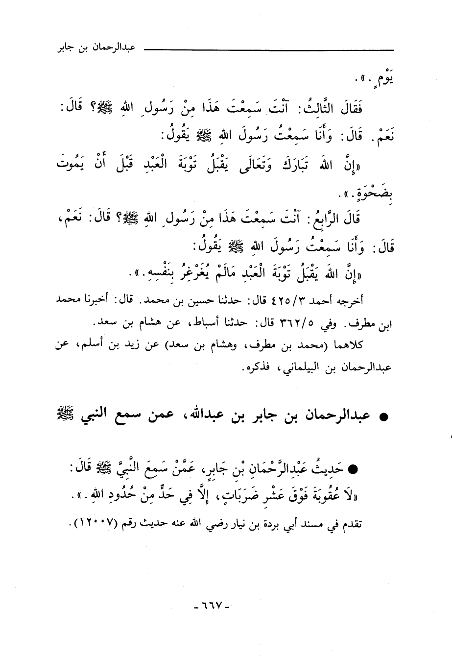 ـ حَدِيثُ عَبْدِالرَّحْمَانِ بْنِ جَابِرٍ، عَمَّنْ سَمِعَ النَّبِيَّ صلى الله عليه وسلم قَالََ: