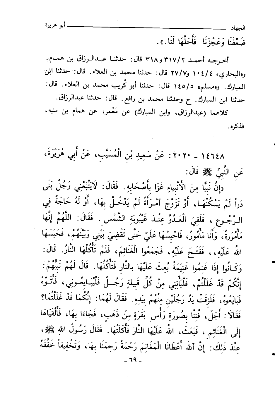 إِنَّ نَبِيًّا مِنَ الأنْبِياءِ غَزَا بِأصْحَابِهِ. فَقَالَ: لَايَتْبَعْنِي رَجُلٌ بَنَى دَرًا لَمْ يَسْكُنْهَا، أَوْ تَزَوَّجَ امْرَأةً لَمْ يَدْخُلْ بِهَا، أوْ لَهُ حَاجَة فِي الرَّجُوعِ، فَلَقِيَ الْعَدُوَّ عِنْدَ غَيْبُويَةِ الشَّمْسِ. فَقَالَ: اللهمَّ إِنَّهَا مَأْمُوَرةٌ، وَأَنَا مَأْمُورٌ، فَاحْبِسْهَا عَلَيَّ حَتَّى تَقْضِيَ بَيْنِي وَبَيْنَهُمْ، فَحَبَسَهَا الله عَلَيْهِ،، فَفَتَحَ عَلَيْهِ، فَجَمَعُوا الْغَنَائِمَ، فَلَمْ تَأْكُلْهَا النَّارُ, قال: وَكَانُوا إِذَا غَنِمُوا غَنِيَمَةً بُعِثَ عَلَيْهَا بالنَّارِ فَتَأْكُلُهَا. قَالَ لَهُمْ نَبِيُّهُمْ: إِنَّكُمْ قَدْ غَلَلْتُمْ، فَلْيَأْتِنِي مِنْ كُلِّ قَبِيلةٍ رَجُلٌ فَلْيُبَايِعُونِي، فَأتَوه فَبَايَعُوهُ، فَلَزِقَتْ يَدُ رَجُلَيْنِ مِنْهُا بيدِهِ. فَقَالَ لَهُمَا: إِنَّكُمَا مَذ غَلَلتُمَا؛ فَقَالَا: أجَلْ، فُتِنَّا بِصُورَةِ رَأْسِ بَقَرَةٍ مِنْ ذَهَبٍ، فَجَاءَا بِهَا، فَألْقَيَاهَا إِلَى الْغَنَائِمِ، فَبَعَثَ، الله عَلَيْهَا النَّارَ فَأكَلتْهَا. فَقَالَ رَسُولُ اللهِ صلى الله عليه وسلم، عِنْدَ ذَلِكَ: إِنَّ اللهَ أعْطَانَا الْمَغَانِمَ رَحْمَةً رَحِمَنَا بِهَا، وَتَخْفِيفًا خففه