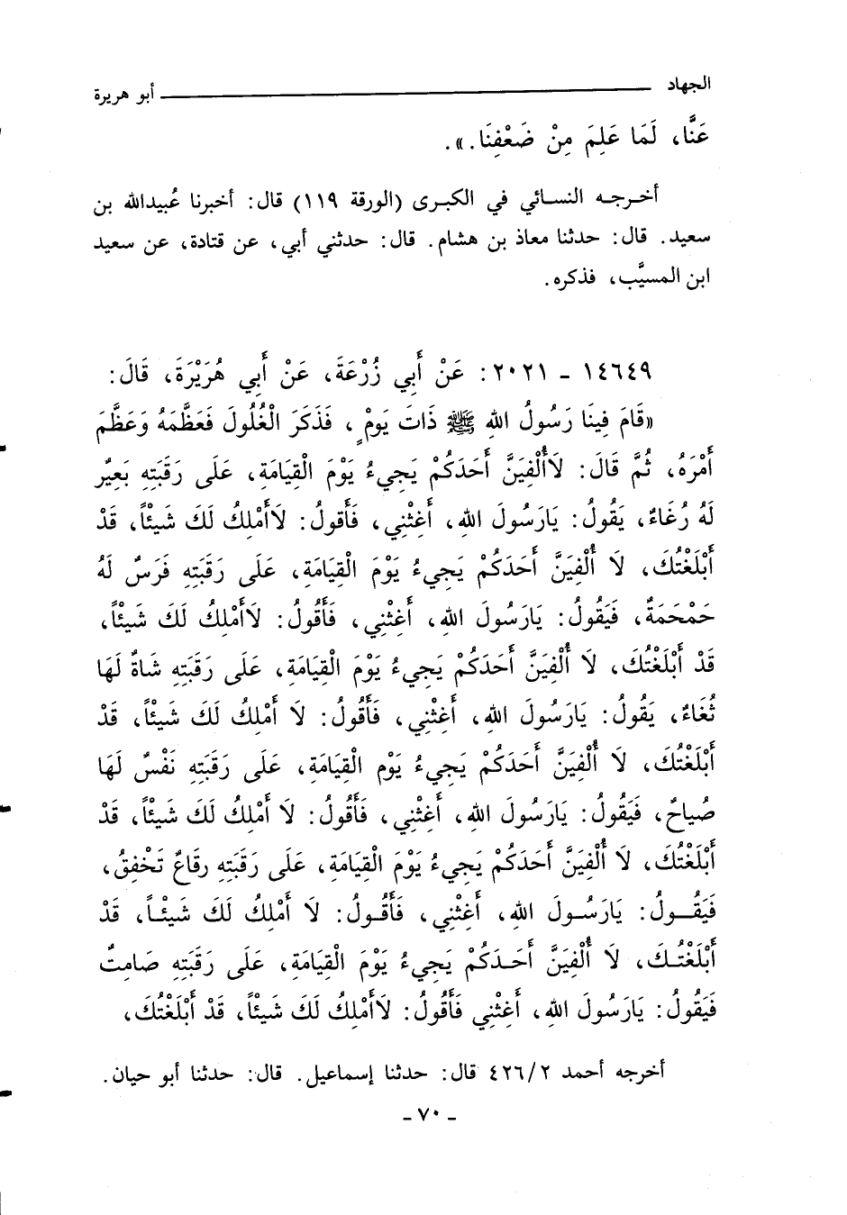 قَامَ فِينَا رَسُولُ اللهِ صلى الله عليه وسلم ذَاتَ يَوْمٍ فَذَكَرَ الْغُلُولَ فَعَظَّمَهُ وَعَظَّمَ أَمْرَهُ ثُمَّ قَالَ لَا أُلْفِيَنَّ أَحَدَكُمْ يَجِئُ يَوْمَ الْقِيَامَةِ عَلَى رَقَبَتِهِ بَعِيرٌ لَهُ رُغَاءٌ يَقُولُ يَا رَسُولَ اللهِ أَغِثْنِى. فَأَقُولُ لَا أَمْلِكُ لَكَ شَيْئًا قَدْ أَبْلَغْتُكَ. لَا أُلْفِيَنَّ أَحَدَكُمْ يَجِئُ يَوْمَ الْقِيَامَةِ عَلَى رَقَبَتِهِ فَرَسٌ لَهُ حَمْحَمَةٌ فَيَقُولُ يَا رَسُولَ اللهِ أَغِثْنِى. فَأَقُولُ لَا أَمْلِكُ لَكَ شَيْئًا قَدْ أَبْلَغْتُكَ. لَا أُلْفِيَنَّ أَحَدَكُمْ يَجِئُ يَوْمَ الْقِيَامَةِ عَلَى رَقَبَتِهِ شَاةٌ لَهَا ثُغَاءٌ يَقُولُ يَا رَسُولَ اللهِ أَغِثْنِى. فَأَقُولُ لَا أَمْلِكُ لَكَ شَيْئًا قَدْ أَبْلَغْتُكَ. لَا أُلْفِيَنَّ أَحَدَكُمْ يَجِئُ يَوْمَ الْقِيَامَةِ عَلَى رَقَبَتِهِ نَفْسٌ لَهَا صِيَاحٌ فَيَقُولُ يَا رَسُولَ اللهِ أَغِثْنِى. فَأَقُولُ لَا أَمْلِكُ لَكَ شَيْئًا قَدْ أَبْلَغْتُكَ. لَا أُلْفِيَنَّ أَحَدَكُمْ يَجِئُ يَوْمَ الْقِيَامَةِ عَلَى رَقَبَتِهِ رِقَاعٌ تَخْفِقُ فَيَقُولُ يَا رَسُولَ اللهِ أَغِثْنِى. فَأَقُولُ لَا أَمْلِكُ لَكَ شَيْئًا قَدْ أَبْلَغْتُكَ. لَا أُلْفِيَنَّ أَحَدَكُمْ يَجِئُ يَوْمَ الْقِيَامَةِ عَلَى رَقَبَتِهِ صَامِتٌ فَيَقُولُ يَا رَسُولَ اللهِ أَغِثْنِى فَأَقُولُ لَا أَمْلِكُ لَكَ شَيْئًا قَدْ أَبْلَغْتُكَ.