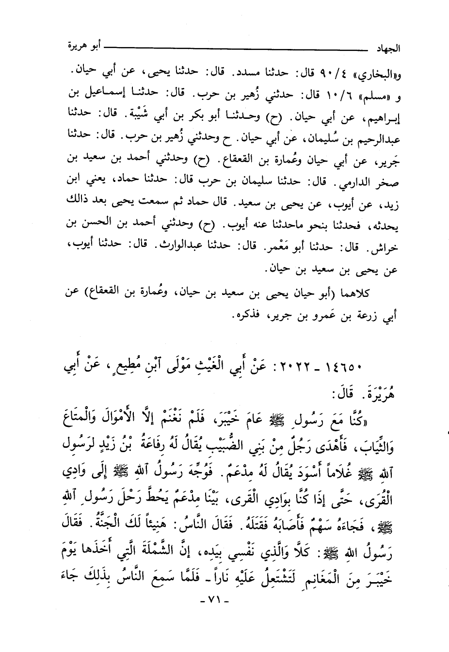 و"البُخاري" ٤/ ٩٠ (٣٠٧٣) قال: حدثنا مسدد, قال: حدثنا يَحيى، عَنْ أَبِي حيان. و"مسلم" ٦/ ١٠ قال: حدثني زُهير بن حرب , قال: حدثنا إسماعيل بن إبراهيم، عَنْ أَبِي حيان. (ح) وحدثنا أبو بكر بن أبي شَيْبة , قال: حدثنا عبد الرحيم بن سُليمان، عَنْ أَبِي حيان. ح وحدثني زُهير بن حرب , قال: حدثنا جَرير، عَنْ أَبِي حيان وعُمارة بن القعقاع. (ح) وحدثني أحمد بن سعيد بن صخر الدارمي , قال: حدثنا سليمان بن حرب قال: حدثنا حماد، يعني ابن زيد، عن أيوب، عن يَحيى بن سعيد. قال حماد ثم سمعت يَحيى بعد ذلك يحدثه، فحدثنا بنحو ماحدثنا عنه أيوب. (ح) وحدثني أحمد بن الحسن بن خراش , قال: حدثنا أبو مَعْمر, قال: حدثنا عبد الوارث , قال: حدثنا أيوب، عن يَحيى بن سعيد بن حيان.