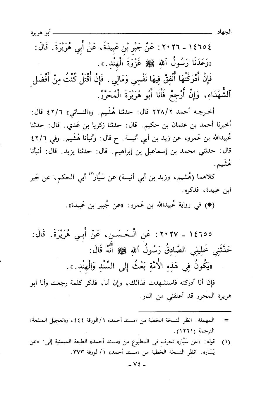 وَعَدَنَا رَسُولُ اللهِ صلى الله عليه وسلم غَزْوَةَ الْهِنْدِ فَإِنْ أَدْرَكْتُهَا أُنْفِقْ فِيهَا نَفْسِى وَمَالِى وَإِنْ قُتِلْتُ كُنْتُ أَفْضَلَ الشُّهَدَاءِ وَإِنْ رَجَعْتُ فَأَنَا أَبُو هُرَيْرَةَ الْمُحَرَّر.