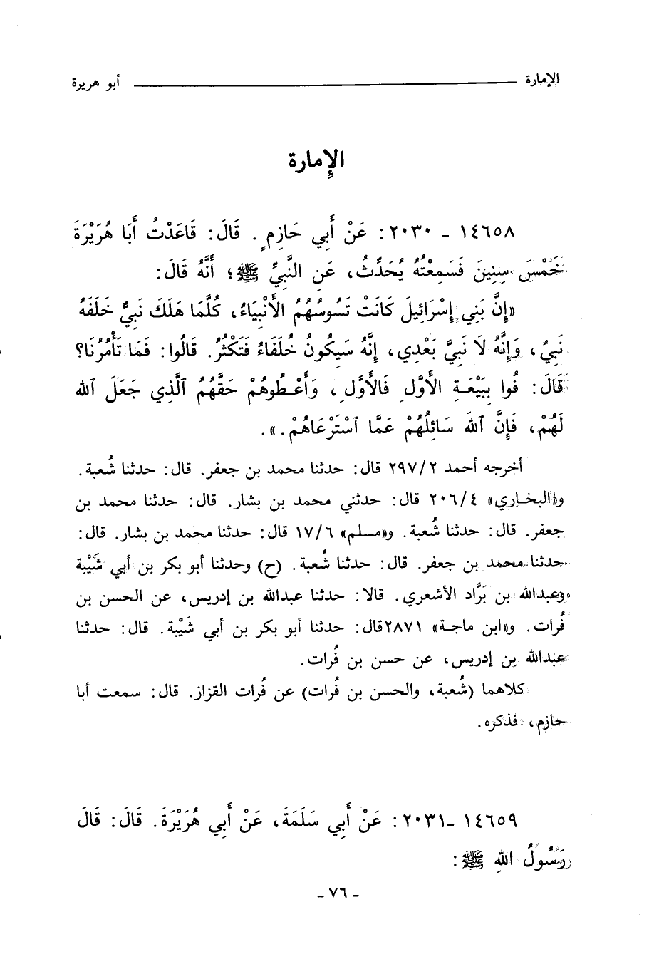 كَانَتْ بَنُو إِسْرَائِيلَ تَسُوسُهُمُ الأَنْبِيَاءُ كُلَّمَا هَلَكَ نَبِىٌّ خَلَفَهُ نَبِىٌّ وَإِنَّهُ لَا نَبِىَّ بَعْدِى وَسَتَكُونُ خُلَفَاءُ فَتَكْثُرُ. قَالُوا فَمَا تَأْمُرُنَا قَالَ فُوا بِبَيْعَةِ الأَوَّلِ فَالأَوَّلِ وَأَعْطُوهُمْ حَقَّهُمْ فَإِنَّ اللَّهَ سَائِلُهُمْ عَمَّا اسْتَرْعَاهُمْ.