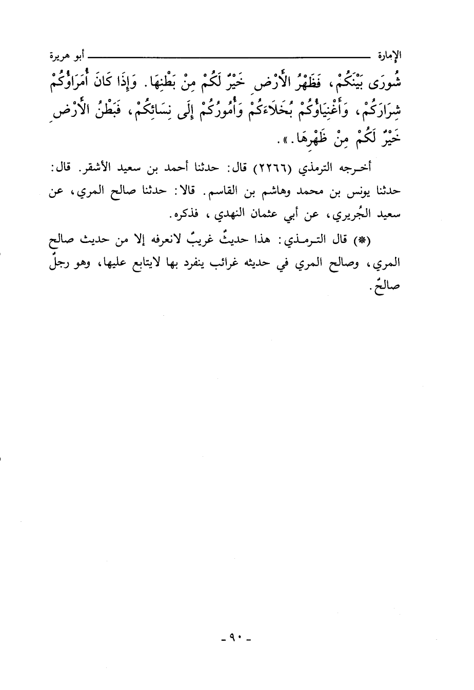 شُورَى بَيْنَكُمْ فَظَهْرُ الأَرْضِ خَيْرٌ لَكُمْ مِنْ بَطْنِهَا وَإِذَا كَانَ أُمَرَاؤُكُمْ شِرَارَكُمْ وَأَغْنِيَاؤُكُمْ بُخَلَاءَكُمْ وَأُمُورُكُمْ إِلَى نِسَائِكُمْ فَبَطْنُ الأَرْضِ خَيْرٌ لَكُمْ مِنْ ظَهْرِهَا.