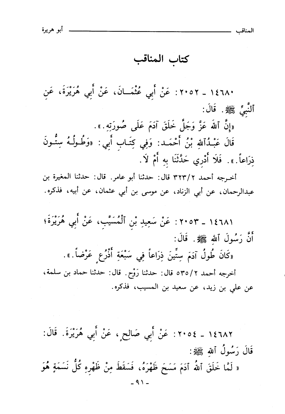كَانَ طُولُ آدَمَ سِتِّينَ ذِرَاعًا فِى سَبْعَةِ أَذْرُعٍ عَرْضًا.