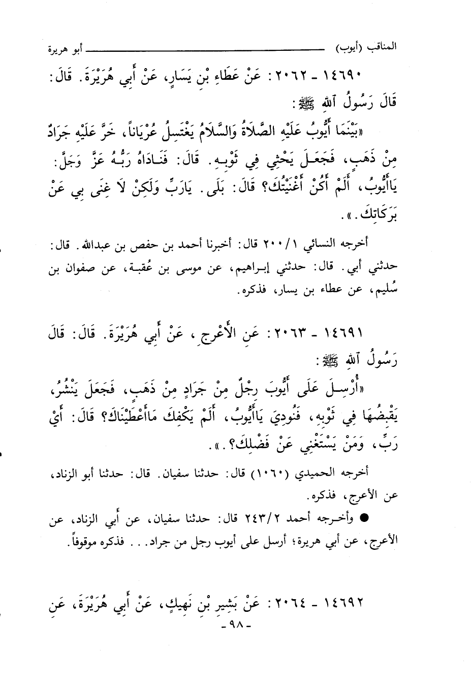 أرْسِلَ عَلَى أَيُّوبَ رِجْلٌ مِنْ جَرَادٍ مِنْ ذَهَبٍ، فَجَعَلَ يَنشر، يَقْبضهَا فِي ثَوْبِهِ، فَنُودِيَ يَا أَيُّوبُ، أَلَمْ يَكْفِكَ مَا أَعْطَيْنَاكَ؛ قَالَ: أيْ ربًّ، وَمَنْ يَستَغْنِي عَنْ فَضْلِكَ.