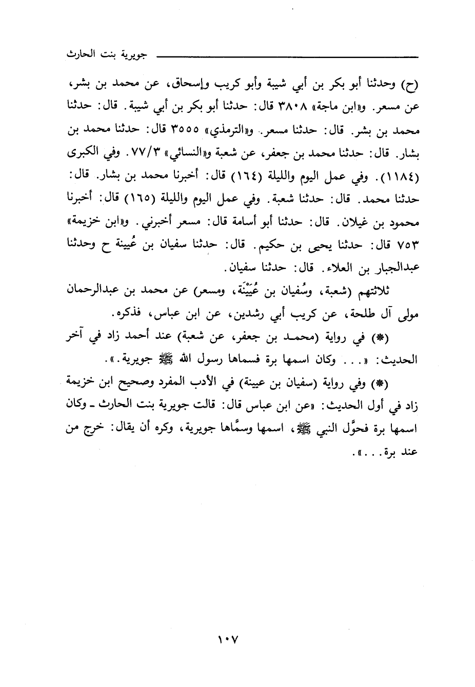 - وفي رواية (سفيان بن عيينة) في (الأدب المفرد) وصحيح ابن خزيمة زاد في أول الحديث: عن ابن عباس قال: قالت جويرية بنت الحارث - وكان اسمها برة فحوَّل النبي صلى الله عليه وسلم، اسمها وسمَّاها جويرية، وكره أن يقال: خرج من عند برة. .