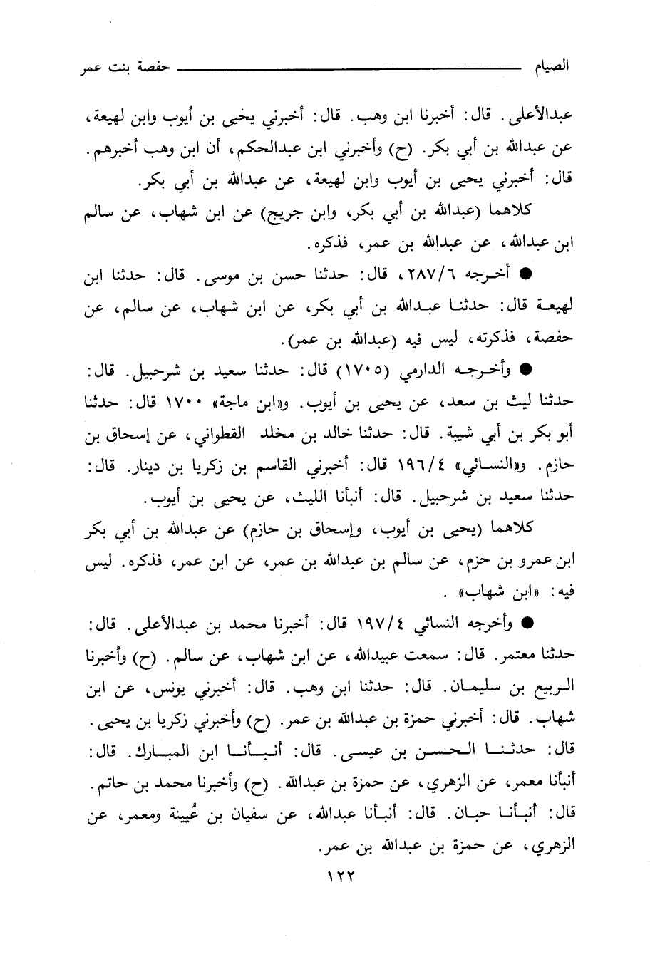 - أخرجه ٦/ ٢٨٧ قال: حدثنا حسن بن موسى , قال: حدثنا ابن لهيعة قال: حدثنا عبد الله بن أبي بكر، عن ابن شهاب، عن سالم، عن حفصة، فذكرته، ليس فيه (عبد الله بن عمر.