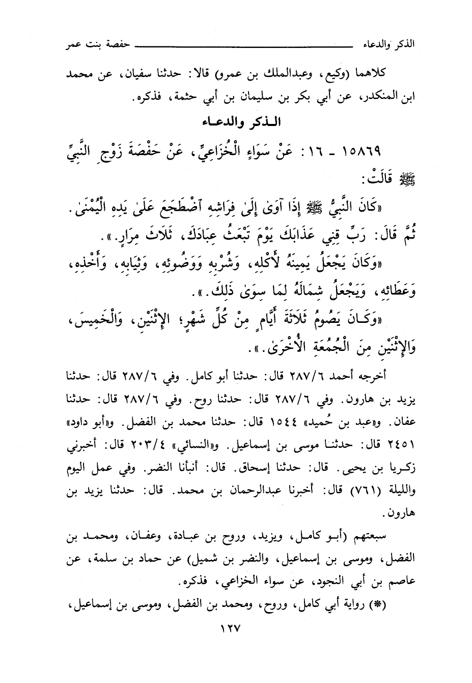 ١٥٨٦٩ - عَنْ سَوَاءٍ الْخُزَاعِىِّ، عَنْ حَفْصَةَ زَوْجِ النَّبِىِّ صلى الله عليه وسلمقالت: