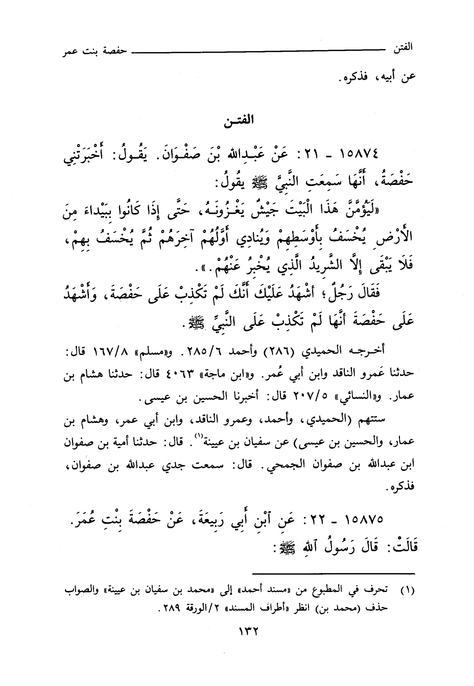 أخرجه الحميدي (٢٨٦) وأحمد ٦/ ٢٨٥. و"مسلم" ٨/ ١٦٧ قال: حدثنا عَمرو الناقد وابن أبي عمر. و"ابن ماجة" ٤٠٦٣ قال: حدثنا هشام بن عمار. و"النَّسائي" ٥/ ٢٠٧ , في "الكبرى" ٣٨٤٩ قال: أخبرنا الحسين بن عيسى.