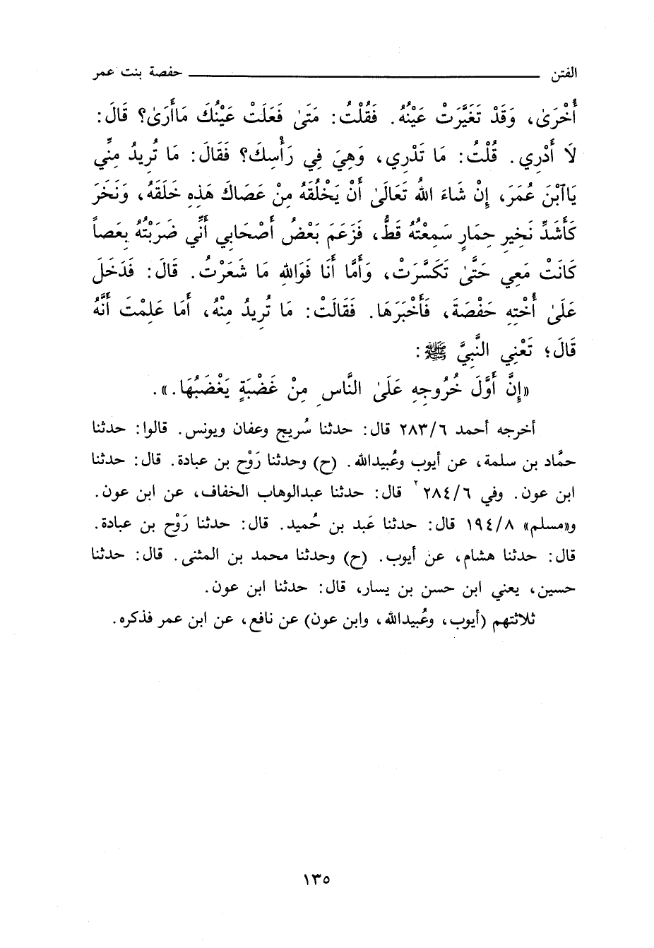 أُخْرَى وَقَدْ تَغَيَّرَتْ عَيْنُهُ فَقُلْتُ: مَتَى فَعَلَتْ عَيْنُكَ مَا أَرَى؟ قال: لَا أَدْرِى. قُلْتُ: لَا تَدْرِى وَهِىَ فِى رَأْسِكَ. فَقال: مَا تُرِيدُ مِنِّى يَا ابْنَ عُمَرَ إِنْ شَاءَ اللَّهُ تَعَالَى أَنْ يَخْلُقَهُ مِنْ عَصَاكَ هَذِهِ خَلَقَهُ. وَنَخَرَ كَأَشَدِّ نَخِيرِ حِمَارٍ سَمِعْتُهُ قَطُّ فَزَعَمَ بَعْضُ أَصْحَابِى أَنِّى ضَرَبْتُهُ بِعَصًا كَانَتْ مَعِى حَتَّى تَكَسَّرَتْ وَأَمَّا أَنَا فَوَاللَّهِ مَا شَعَرْتُ - قَالَ - فَدَخَلَ عَلَى أُخْتِهِ حَفْصَةَ فَأَخْبَرَهَا فَقالت: مَا تُرِيدُ مِنْهُ، أَمَا عَلِمْتَ أَنَّهُ قَالَ؛ تَعْنِى النَّبِىَّ صلى الله عليه وسلم: