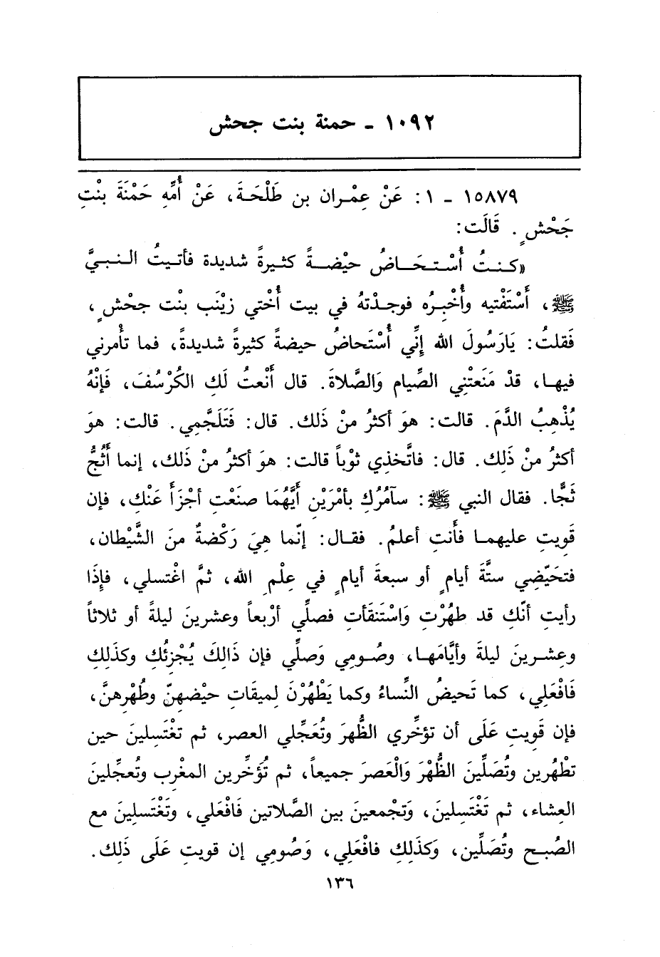 كُنْتُ أُسْتَحَاضُ حَيْضَةً كَثِيرَةً شَدِيدَةً فَأَتَيْتُ النَّبِىَّ صلى الله عليه وسلم وسلم أَسْتَفْتِيهِ وَأُخْبِرُهُ فَوَجَدْتُهُ فِى بَيْتِ أُخْتِي زَيْنَبَ بِنْتِ جَحْشٍ فَقُلْتُ: يَا رَسُولَ اللَّهِ إِنِّى أُسْتَحَاضُ حَيْضَةً كَثِيرَةً شَدِيدَةً، فَمَا تَأْمُرُنِي فِيهَا، قَدْ مَنَعَتْنِي الصِّيَامَ وَالصَّلَاةَ , قال: أَنْعَتُ لَكِ الْكُرْسُفَ، فَإِنَّهُ يُذْهِبُ الدَّمَ. قالت: هُوَ أَكْثَرُ مِنْ ذَلِكَ قال: فَتَلَجَّمِي. قالت: هُوَ أَكْثَرُ مِنْ ذَلِكَ قال: فَاتَّخِذِي ثَوْبًا. قالت: هُوَ أَكْثَرُ مِنْ ذَلِكَ إِنَّمَا أَثُجُّ ثَجًّا فَقَالَ النَّبِىُّ صلى الله عليه وسلم: سَآمُرُكِ بِأَمْرَيْنِ أَيَّهُمَا صَنَعْتِ أَجْزَأَ عَنْكِ، فَإِنْ قَوِيتِ عَلَيْهِمَا فَأَنْتِ أَعْلَمُ. فَقال: إِنَّمَا هِىَ رَكْضَةٌ مِنَ الشَّيْطَانِ، فَتَحَيَّضِي سِتَّةَ أَيَّامٍ أَوْ سَبْعَةَ أَيَّامٍ فِى عِلْمِ اللَّهِ، ثُمَّ اغْتَسِلِي، فَإِذَا رَأَيْتِ أَنَّكِ قَدْ طَهُرْتِ وَاسْتَنْقَأْتِ فَصَلِّى أَرْبَعًا وَعِشْرِينَ لَيْلَةً أَوْ ثَلَاثًا وَعِشْرِينَ لَيْلَةً وَأَيَّامَهَا، وَصُومِي وَصَلِّي فَإِنَّ ذَلِكِ يُجْزِئُكِ وَكَذَلِكِ فَافْعَلِي، كَمَا تَحِيضُ النِّسَاءُ وَكَمَا يَطْهُرْنَ لِمِيقَاتِ حَيْضِهِنَّ وَطُهْرِهِنَّ، فَإِنْ قَوِيتِ عَلَى أَنْ تُؤَخِّرِي الظُّهْرَ وَتُعَجِّلِي الْعَصْرَ، ثُمَّ تَغْتَسِلِينَ حِينَ تَطْهُرِينَ وَتُصَلِّينَ الظُّهْرَ وَالْعَصْرَ جَمِيعًا، ثُمَّ تُؤَخِّرِينَ الْمَغْرِبَ وَتُعَجِّلِينَ الْعِشَاءَ، ثُمَّ تَغْتَسِلِينَ وَتَجْمَعِينَ بَيْنَ الصَّلَاتَيْنِ فَافْعَلِي، وَتَغْتَسِلِينَ مَعَ الصُّبْحِ وَتُصَلِّينَ، وَكَذَلِكِ فَافْعَلِي