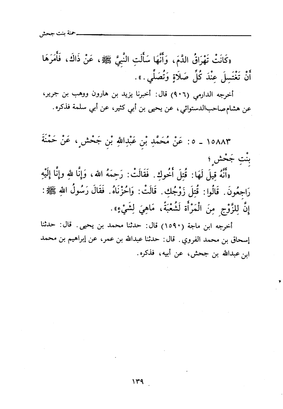 ١٥٨٨٣ - عَنْ مُحَمَّدِ بْنِ عبد الله بْنِ جَحْشٍ، عَنْ حَمْنَةَ بِنْتِ جَحْشٍ؛