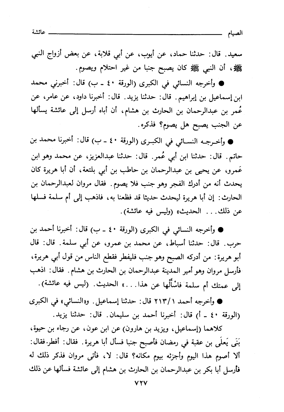 - واخرجه النسائي في "الكبرى" (الورقة ٤٥ - ب) قال: اخبرنا أحمد بن حرب. قال: حدثنا اسباط، عن محمد بن عمرو، عن ابي سلمة. قال: قال أبو هريرة: من ادركه الصبح وهو جنب فليفطر فقطع الناس من قول ابي هريرة، فارسل مروان وهو امير المدينة عبد الرحمن بن الحارث بن هشام. فقال: اذهب الى عمتك ام سلمة فاسالْها عن هذا. . . الحديث (ليس فيه عائشة.