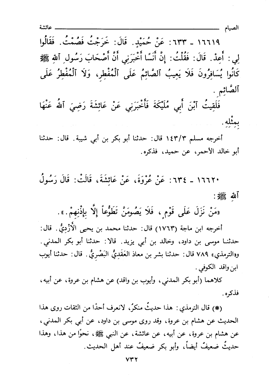- قال الترمذي: هذا حديث منكرٌ، لانعرف احدًا من الثقات روى هـ-ذا الحديث عن هشام بن عروة، وقد روى موسى بن داود، عن ابي بكر المدني، عن هشام بن عروة، عن ابيه، عن عائشة، عن النبي صلى الله عليه وسلم، نحوًا من هذا، وهذا حديث ضعيفٌ ايضا، وابو بكر ضعيفٌ عند اهل الحديث.