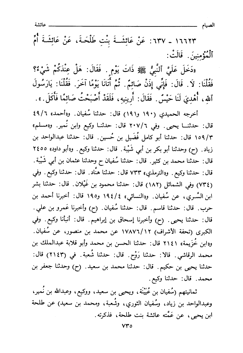 أخرجه الحميدي (١٩٠ و ١٩١) قال: حدثنا سُفيان. و"أحمد" ٦/ ٤٩ قال: حدثنا يحيى. وفي ٦/ ٢٠٧ قال: حدثنا وكيع وابن نمير. و"مسلم" ٣/ ١٥٩ قال: حدثنا أبو كامل فُضَيل بن حُسين. قال: حدثنا عبد الواحد بن زياد (ح) وحدثنا أبو بكر بن ابي شَيْبة. قال: حدثنا وكيع. و"أبو داود" ٢٤٥٥ قال: حدثنا محمد بن كثير. قال: حدثنا سُفيان (ح) وحدثنا عثمان بن ابي شَيْبة. قال: حدثنا وكيع. و"التِّرمِذي" ٧٣٣ قال: حدثنا هنَّاد. قال: حدثنا وكيع. وفي (٧٣٤) وفي الشمائل (١٨٢) قال: حدثنا محمود بن غَيْلان. قال: حدثنا بشر بن السِّري، عن سُفيان. و"النَّسائي" ٤/ ١٩٤ و ١٩٥ قال: اخبرنا أحمد بن حرب. قال: حدثنا قاسم. قال: حدثنا سُفيان (ح) واخبرنا عَمرو بن علي. قال: حدثنا يحيى (ح) واخبرنا اسحاق بن إبراهيم. قال: انبانا وكيع. وفي "الكبرى" (تحفة الاشراف) ١٢/ ١٧٨٧٦ عن محمد بن منصور، عن سُفيان. و"ابن خزيمة" ٢١٤١ قال: حدثنا الحسن بن محمد وابو قلابة عبد الملك بن محمد الرقاشي. قالا: حدثنا رَوْح. قال: حدثنا شُعبة. في (٢١٤٣) قال: حدثنا يحيى بن حكيم. قال: حدثنا محمد بن سعيد (ح) وحدثنا جعفر بن محمد. قال: حدثنا وكيع.