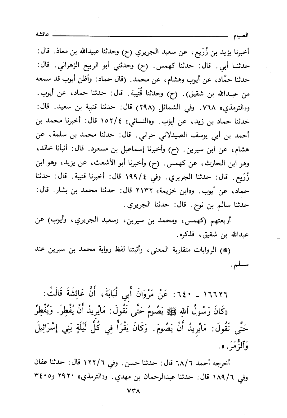 اخبرنا يزيد بن زُرَيع، عن سعيد الجريري (ح) وحدثنا عبيد الله بن معاذ. قال: حدثنا ابي. قال: حدثنا كهمس (ح) وحدثني أبو الربيع الزهراني. قال: حدثنا حمَّاد، عن ايوب وهشام، عن محمد (قال حماد: واظن ايوب قد سمعه من عبد الله بن شقيق) (ح) وحدثنا قُتَيبة. قال: حدثنا حماد، عن ايوب. و"التِّرمِذي" ٧٦٨. وفي الشمائل (٢٩٨) قال: حدثنا قتيبة بن سعيد. قال: حدثنا حماد بن زيد، عن ايوب. و"النَّسائي" ٤/ ١٥٢ قال: اخبرنا محمد بن أحمد بن ابي يوسف الصيدلاني حراني. قال: حدثنا محمد بن سلمة، عن هشام، عن ابن سيرين (ح) واخبرنا اسماعيل بن مسعود. قال: انبانا خالد، وهو ابن الحارث، عن كهمس (ح) واخبرنا أبو الاشعث، عن يزيد، وهو ابن زُرَيع. قال: حدثنا الجريري. وفي ٤/ ١٩٩ قال: اخبرنا قتيبة. قال: حدثنا حماد، عن ايوب. و"ابن خزيمة" ٢١٣٢ قال: حدثنا محمد بن بشار. قال: حدثنا سالم بن