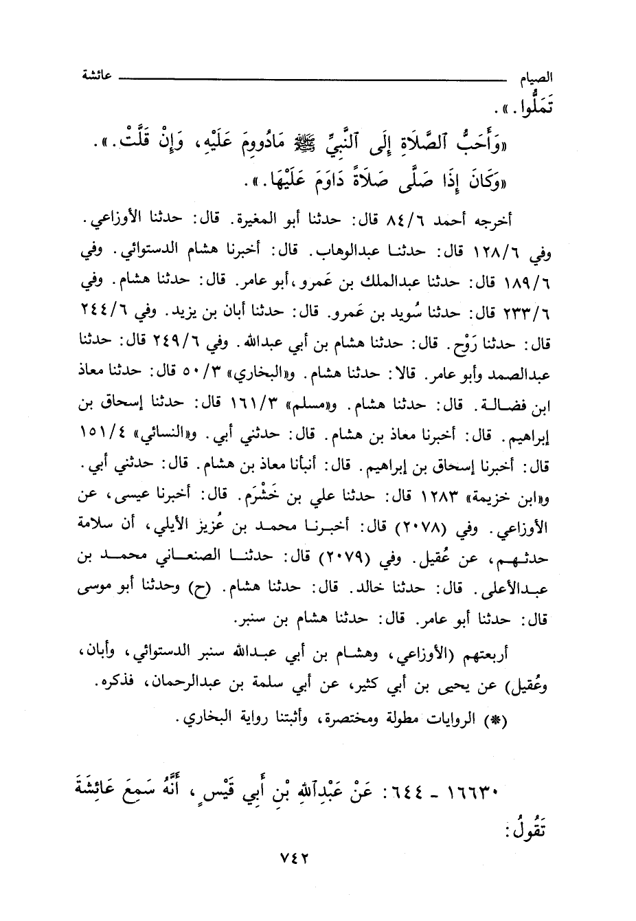 أخرجه أحمد ٦/ ٨٤ قال: حدثنا أبو المغيرة. قال: حدثنا الاوزاعي. وفي ٦/ ١٢٨ قال: حدثنا عبد الوهاب. قال: اخبرنا هشام الدستوائي. وفى ٦/ ١٨٩ قال: حدثنا عبد الملك بن عَمرو، أبو عامر. قال: حدثنا هشام. وفي ٦/ ٢٣٣ قال: حدثنا سُويد بن عَمرو. قال: حدثنا ابان بن يزيد. وفي ٦/ ٢٤٤ قال: حدثنا رَوْح. قال: حدثنا هشام بن ابي عبد الله. وفي ٦/ ٢٤٩ قال: حدثنا عبد الصمد وابو عامر. قالا: حدثنا هشام. و"البُخَارِي" ٣/ ٥٠ قال: حدثنا معاذ بن فضالة. قال: حدثنا هشام. و"مسلم" ٣/ ١٦١ قال: حدثنا اسحاق بن إبراهيم. قال: اخبرنا معاذ بن هشام. قال: حدثني ابي. و"النَّسائي" ٤/ ١٥١ قال: اخبرنا اسحاق بن إبراهيم. قال: انبانا معاذ بن هشام. قال: حدثني ابي. و"ابن خزيمة" ١٢٨٣ قال: حدثنا علي بن خَشْرَم. قال: اخبرنا عيسى، عن الاوزاعي. وفي (٢٠٧٨) قال: اخبرنا محمد بن عُزيز الايلي، ان سلامة حدثهم، عن عُقيل. وفي (٢٠٧٩) قال: حدثنا الصنعاني محمد بن عبد الاعلى. قال: حدثنا خالد. قال: حدثنا هشام (ح) وحدثنا أبو موسى قال: حدثنا أبو عامر. قال: حدثنا هشام بن سنبر.